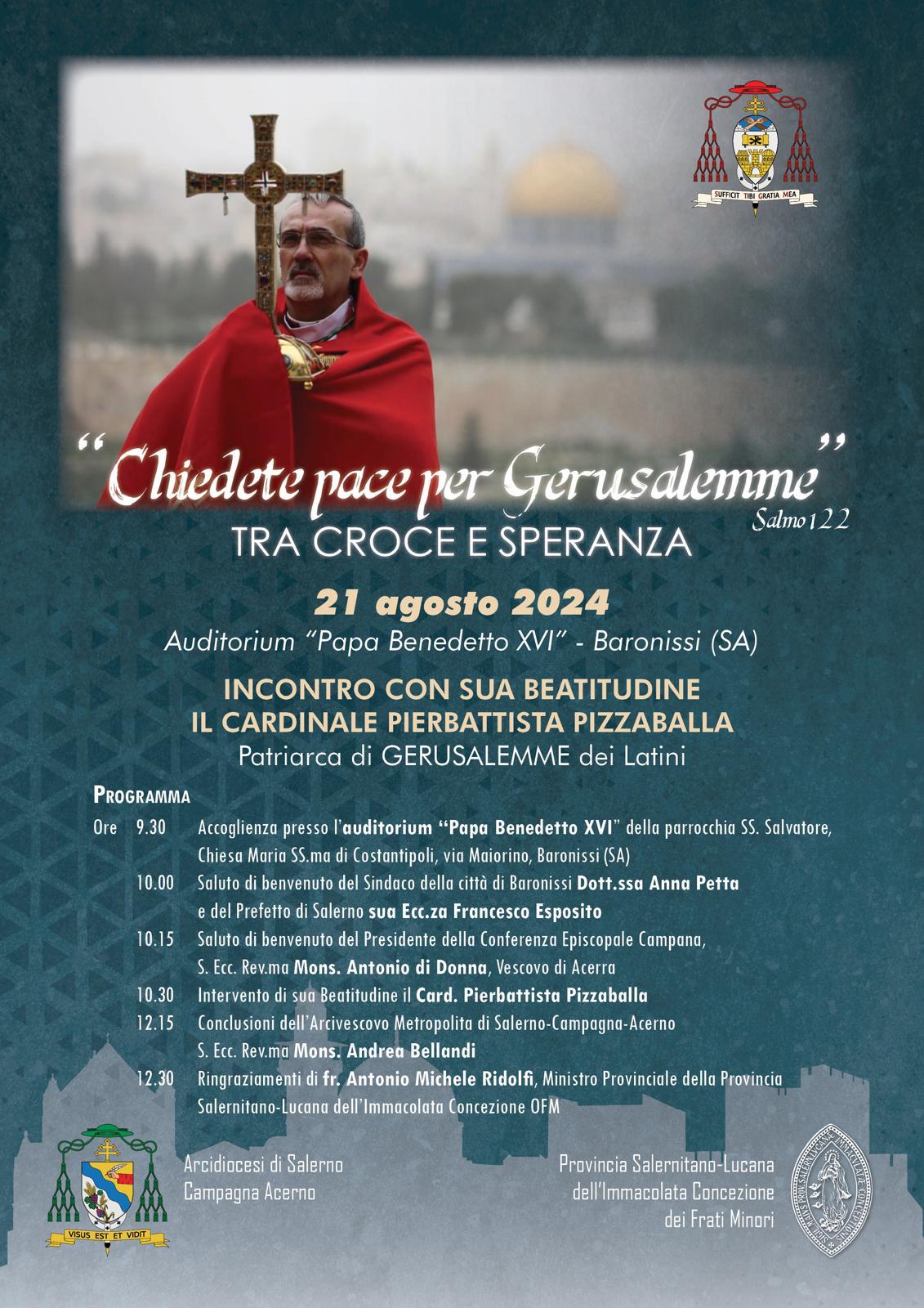 “Chiedete pace per Gerusalemme”. Questo il tema che il cardinale Pierbattista Pizzaballa, patriarca latino di Gerusalemme, affronterà mercoledì 21 agosto alle ore 9.30, presso l’auditorium “Papa Benedetto XVI” di Baronissi. Relazioneranno tra gli altri il prefetto di Salerno Francesco Esposito, il presidente della CEC, S.E. Mons. Antonio Di Donna e il nostro Arcivescovo S.E. Mons. Andrea Bellandi.