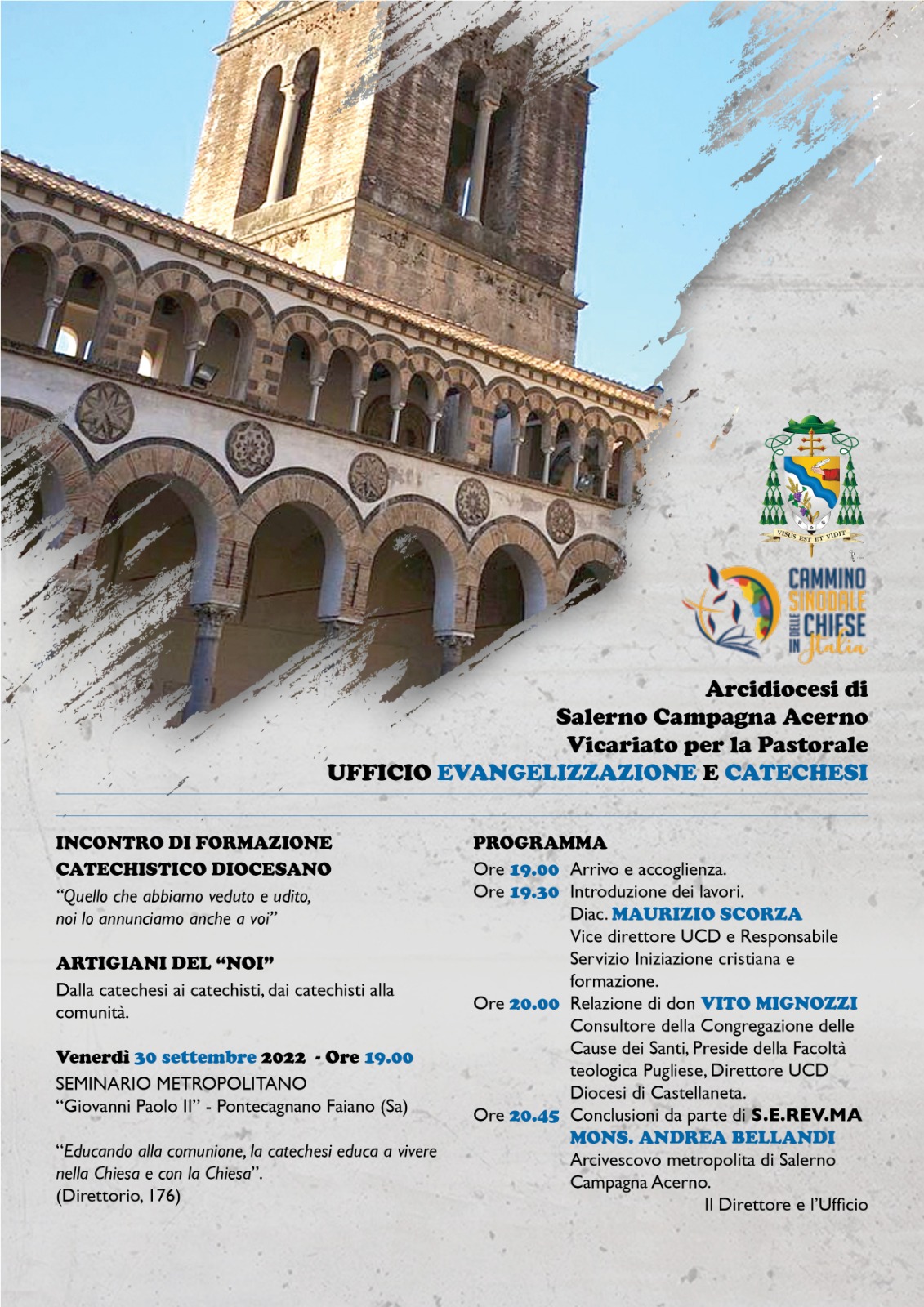 Venerdì 30 settembre alle ore 19.00 presso il Seminario Metropolitano “Giovanni Paolo II” si tiene un incontro di formazione catechistico diocesano dal titolo “Artigiani del noi, dalla catechesi ai catechisti, dai catechisti alla comunità”.