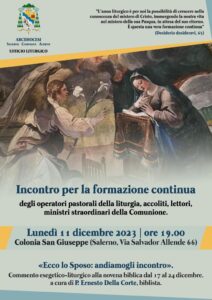 Incontro di formazione continua (tappa di Avvento-Natale) per gli operatori pastorali della liturgia, accoliti, lettori e ministri straordinari della Comunione.