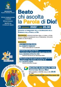 Venerdì 21 gennaio alle ore 20.30 sulla piattaforma Google Meet, si tiene un incontro di formazione per la celebrazione della Domenica della Parola di Dio organizzato dall’Ufficio Evangelizzazione e Catechesi, dall’Ufficio Liturgico e dal Servizio per l’Apostolato Biblico.
