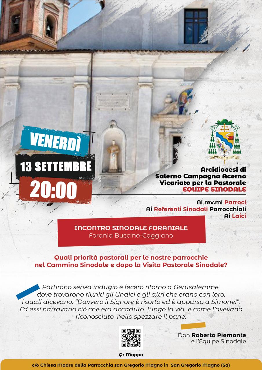 Venerdì 13 settembre alle ore 20.00 si terrà l’Incontro Sinodale della Forania di Buccino-Caggiano presso la chiesa madre di San Gregorio Magno. La domanda che percorrerà l’incontro sarà “Quali priorità pastorali per le nostre parrocchie nel Cammino Sinodale e dopo la Visita Pastorale?”.