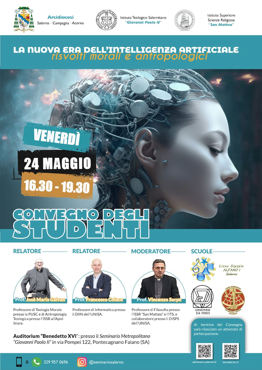 Venerdì 24 maggio dalle ore 16.30 alle ore 19.30, presso l’Auditorium “Benedetto XVI” del Seminario Metropolitano “Giovanni Paolo II” di Pontecagnano Faiano (Sa), si terrà il Convegno organizzato dalle Segreterie degli Studenti dell’ITS e dell’ISSR, in collaborazione con l’IIS “Genovesi – Da Vinci”, il Liceo Sperimentale Statale “Alfano I” e il Liceo Scientifico Statale “Francesco Severi”.