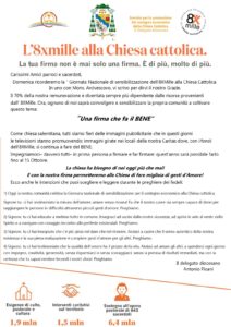 Inizia domenica 5 maggio, in tutte le parrocchie della nostra Arcidiocesi, la campagna di promozione a sostegno della firma 8xmille per la Chiesa Cattolica. Il 70% della remunerazione dei sacerdoti è diventata sempre più dipendente da questa risorsa. Il Servizio diocesano del Sovvenire invita tutti i sacerdoti a sensibilizzare le loro comunità.