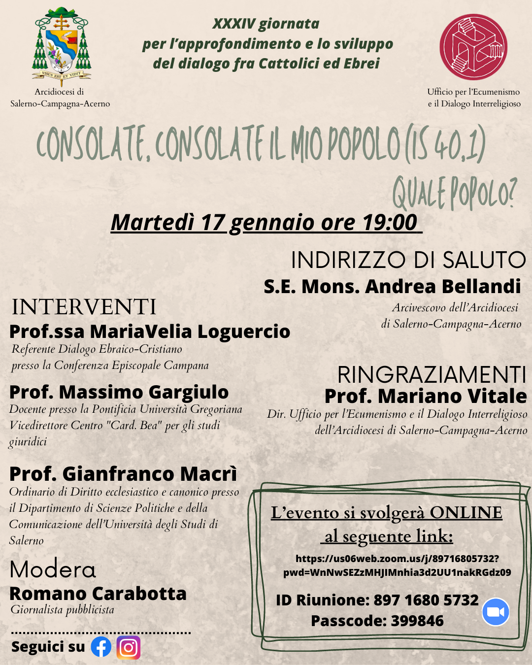 Martedì 17 gennaio alle ore 19.00 l’Ufficio per l’Ecumenismo e il Dialogo interreligioso dell’Arcidiocesi di Salerno-Campagna-Acerno organizza un incontro sulla piattaforma Zoom sul tema scelto che, come scrivono i Vescovi nel loro messaggio, è «un annuncio di consolazione per il popolo, chiamato a stare saldo nella fiducia che il suo Signore non lo abbandonerà: “Nahamù nahamù ‘ammì”, “Consolate, consolate il mio popolo” (Is 40,1). Possiamo avere fiducia nel futuro perché la Parola di Dio ci garantisce che egli è fedele».