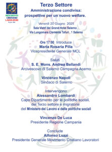 Venerdì 20 giugno alle ore 17.00, si terrà una giornata di lavori per il Consiglio generale del Movimento Cristiano lavoratori presso il Grand Hotel di Salerno e terminerà sabato 21 giugno con la Santa Messa officiata dall’Arcivescovo Mons. Andrea Bellandi.