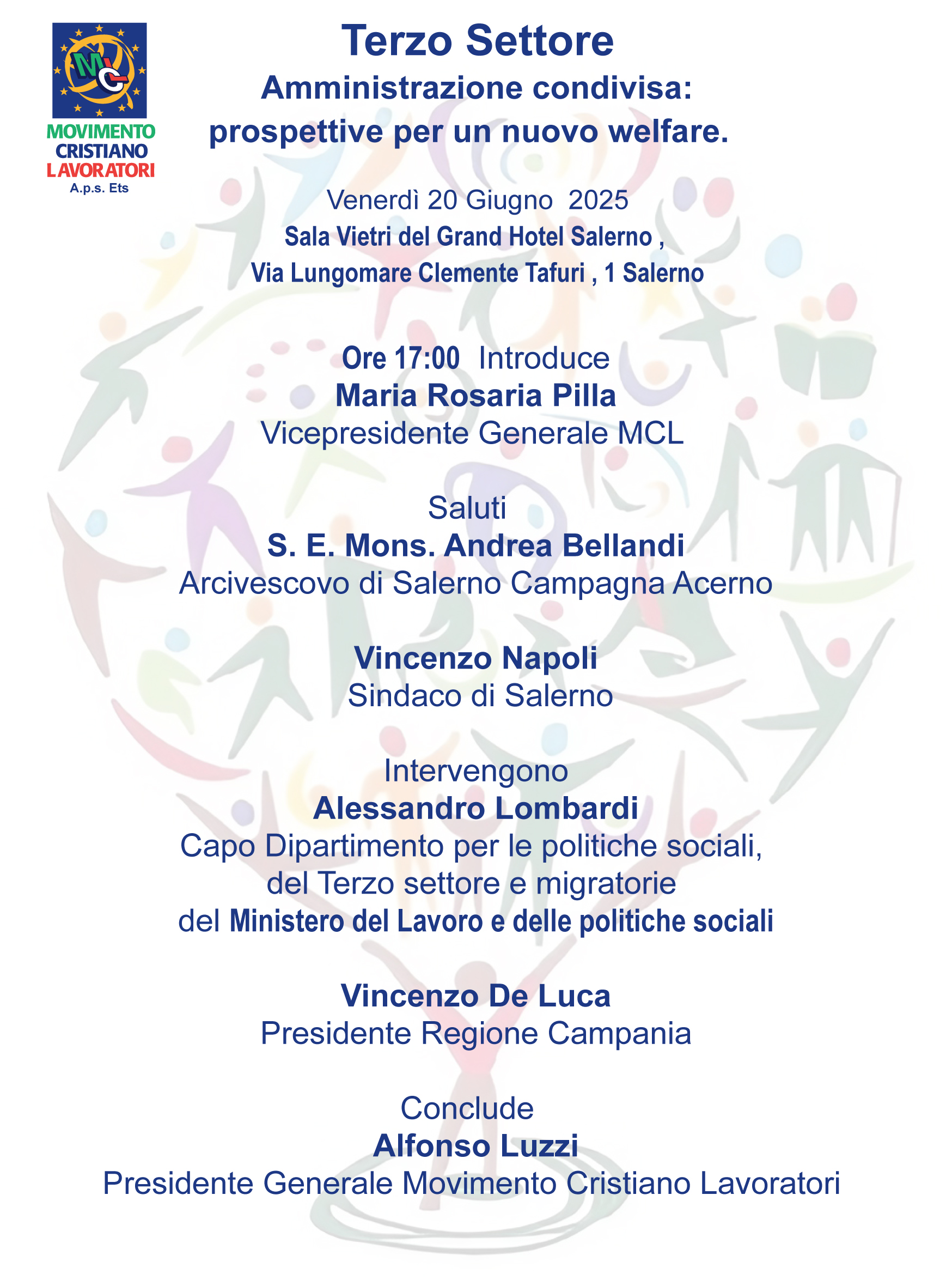 Saranno presenti a Salerno tutti i dirigenti generali del Movimento Cristiano Lavoratori che rappresentano il territorio italiano. I lavori dei consiglieri generali saranno guidati dal Presidente MCL Alfonso Luzzi. A introdurre sarà Maria Rosaria Pilla presidente dell’Unione Provinciale MCL Salerno e Vicepresidente generale; A seguire: i saluti di S. E. Mons. Andrea Bellandi , Arcivescovo di Salerno Campagna Acerno, del Sindaco, Vincenzo Napoli. Relatori di questo importante momento di confronto saranno: Alessandro Lombardi – Capo Dipartimento per le politiche Sociali, del Terzo settore e migratorie del Ministero del Lavoro e l’On. Vincenzo De Luca, Presidente della Regione Campania. Le conclusioni saranno affidate al Presidente Alfonso Luzzi.