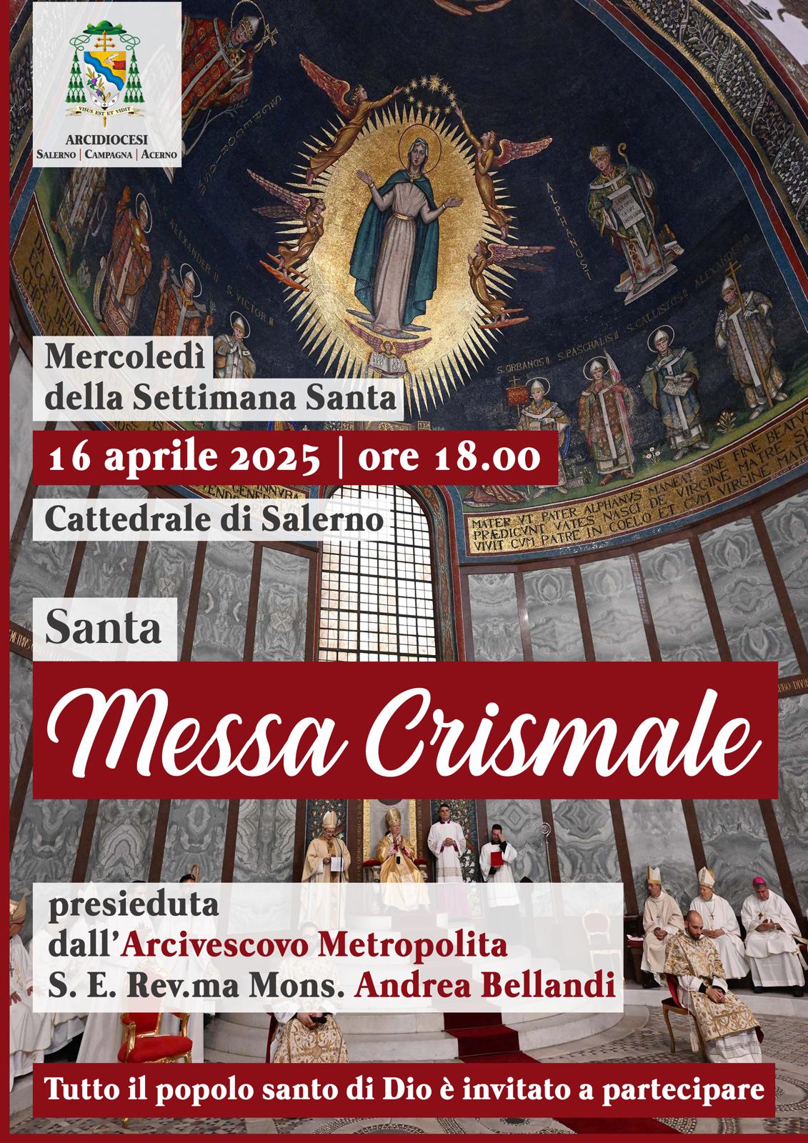 Mercoledì 16 aprile, alle ore 18.00 nella Cattedrale di Salerno, S.E. Mons. Andrea Bellandi presiederà la Santa Messa Crismale. Tutto il popolo santo di Dio che è in Salerno-Campagna-Acerno è invitato a partecipare.
