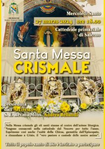 Mercoledì 27 marzo, alle ore 18.00 nella Cattedrale di Salerno, S.E. Mons. Andrea Bellandi presiederà la Santa Messa Crismale. Tutto il popolo santo di Dio che è in Salerno-Campagna-Acerno è invitato a partecipare.