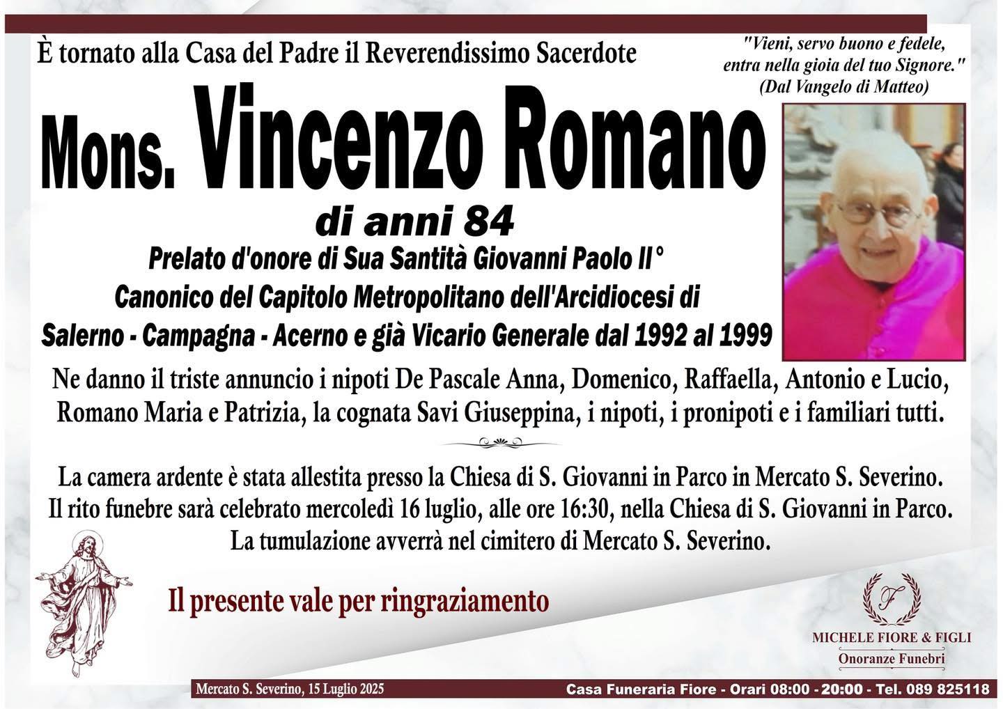 Il 15 luglio, ha concluso la sua esistenza terrena Mons. Vincenzo Romano.