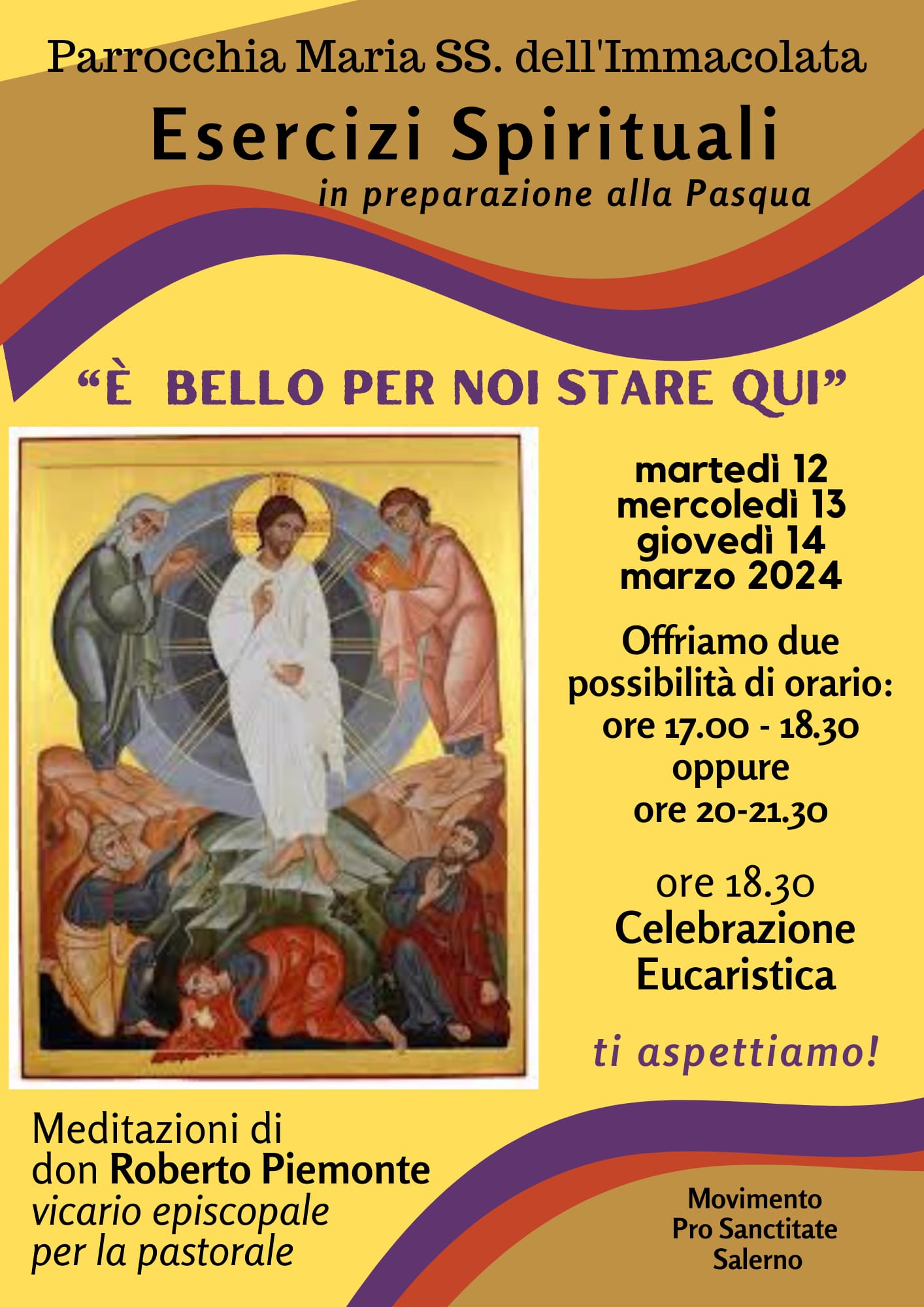 Martedì 12 marzo p.v. iniziano gli esercizi spirituali in preparazione dalla Pasqua presso la parrocchia Maria SS. dell’Immacolata, Salerno, organizzati dal Movimento Pro Sanctitate a cura di Don Roberto Piemonte, Vicario episcopale per la Pastorale.