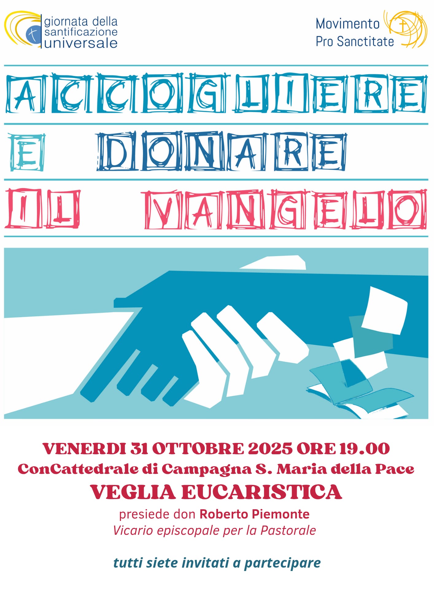 Venerdì 31 ottobre alle ore 19.00, presso la Concattedrale di Campagna Santa Maria della Pace, si terrà la Veglia Eucaristica sul tema “Accogliere e donare il Vangelo”.