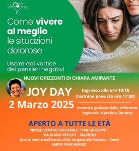 Domenica 2 marzo presso il Centro Pastorale San Giuseppe, in zona Pastena, Salerno, dalle ore 10.15 alle ore 17.00 si terrà il “Joy Day” in videoconferenza con Chiara Amirante da Cittadella Cielo (Frosinone).L’evento è aperto a tutti e sarà animato dal gruppo del Cenacolo di Nuovi Orizzonti Salerno in collaborazione con Chiara Amirante e Cittadella Cielo Frosinone, con i gruppi Regionali locali di Nuovi Orizzonti Campania e con il Gruppo Giovani di Nuovi Orizzonti Campania.