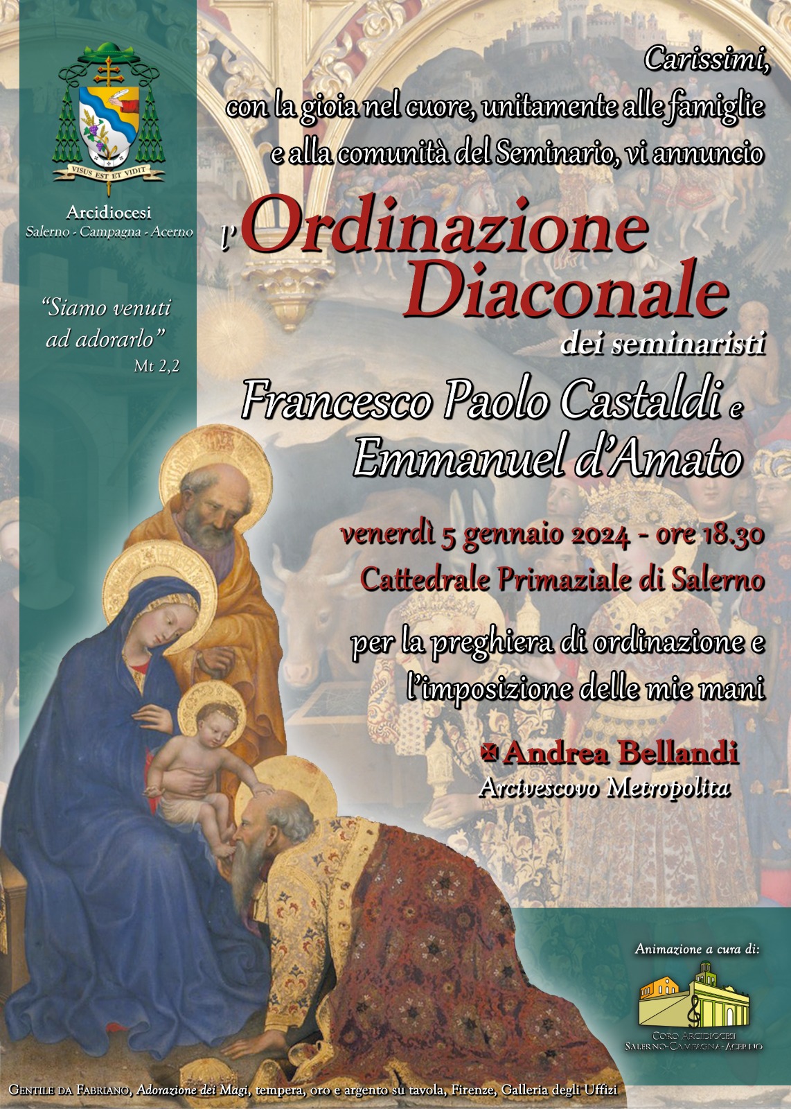 Venerdì 5 gennaio alle ore 18.30 presso la Cattedrale dei Santi Matteo e Gregorio Magno in Salerno, per l’imposizione delle mani e la preghiera consacratoria di S.E. Mons. Andrea Bellandi, verranno ordinati Diaconi i seminaristi Francesco Paolo Castaldi e Emmanuel D’Amato.