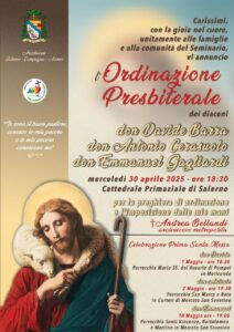 Mercoledì 30 aprile 2025 alle ore 18.30 presso la Cattedrale di Salerno, per l’imposizione delle mani e la preghiera consacratoria di S.E. Mons. Andrea Bellandi, saranno ordinati Presbiteri i diaconi: Don Davide Barra, Don Antonio Cerasuolo e Don Emmanuel Gagliardi.