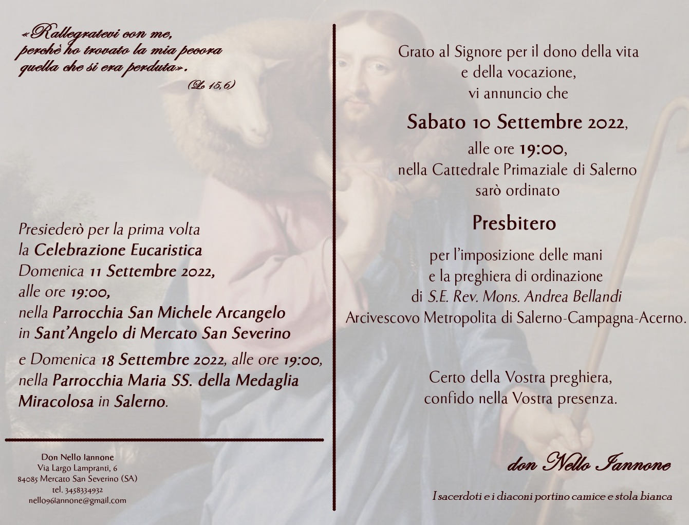 Il novello presbitero presiede per la prima volta l’Eucaristia domenica 11 settembre alle ore 19.00 presso la parrocchia di San Michele Arcangelo in Sant’Angelo di Mercato San Severino.