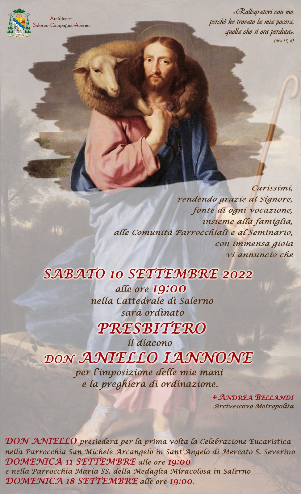 Sabato 10 settembre alle ore 19.00 presso la Cattedrale di Salerno, per l’imposizione delle mani e la preghiera di S.E. Mons. Andrea Bellandi verrà ordinato presbitero il diacono don Aniello Iannone.