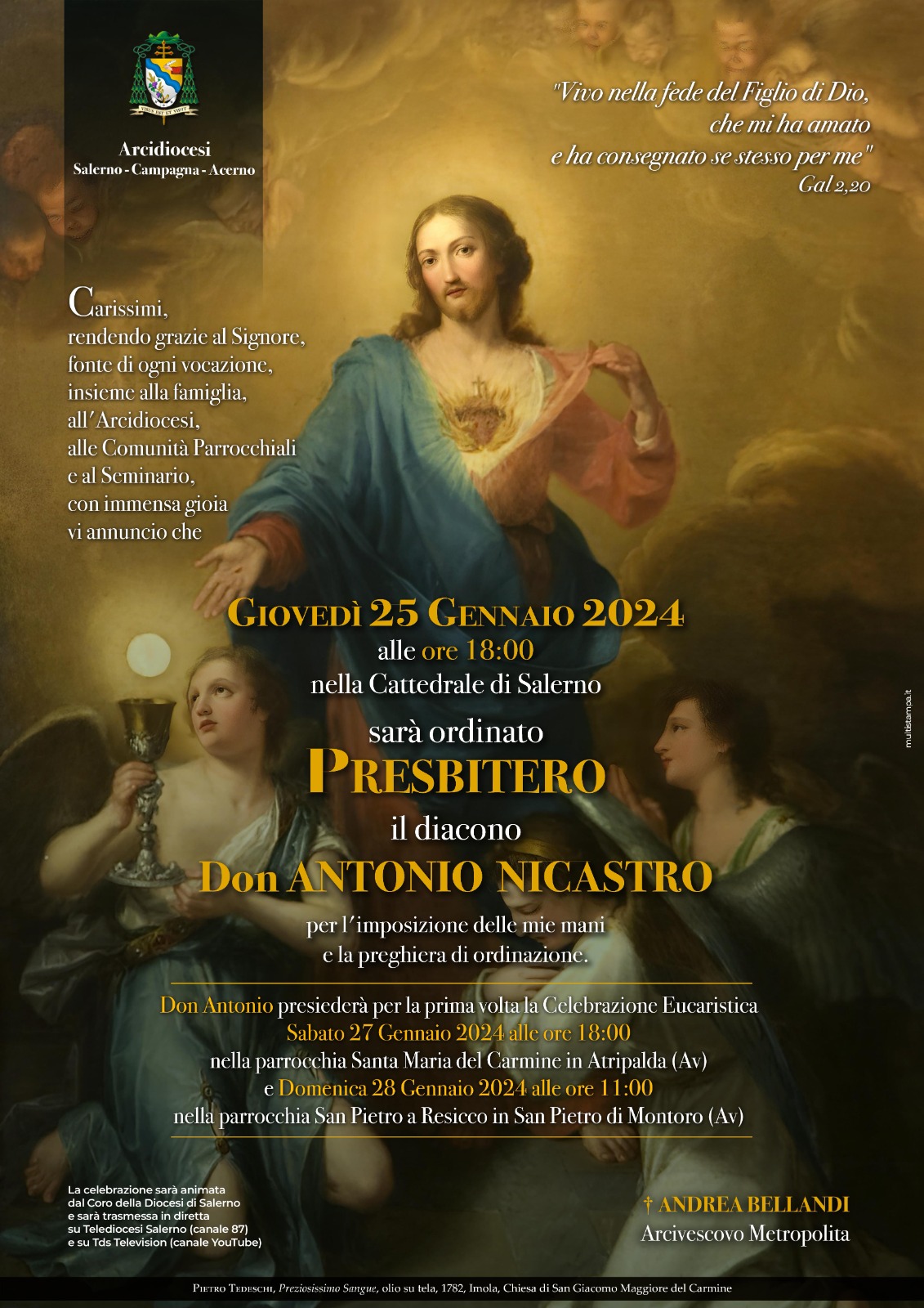 Giovedì 25 gennaio 2024 alle ore 18.00 nella Cattedrale di Salerno sarà ordinato Presbitero Don Antonio Nicastro per l’imposizione delle mani e la preghiera di ordinazione di S.E. Mons. Andrea Bellandi.