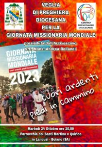 Martedì 24 ottobre alle ore 20.00, Veglia Diocesana Missionaria, presso la parrocchia dei Santi Martino e Quirico di Lancusi, presieduta dal nostro Arcivescovo e organizzata in sinergia con numerose realtà religiose missionarie del nostro territorio e con i gruppi di diverse parrocchie. Un momento di preghiera e di festa.