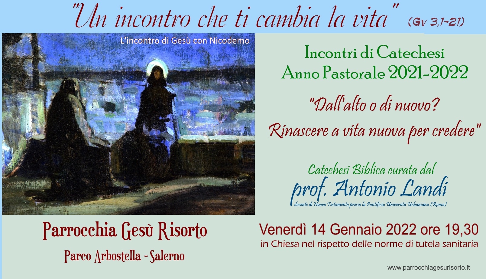 Venerdì 14 gennaio la comunità parrocchiale continuerà il percorso di Catechesi Biblica con il prof. don Antonio Landi (docente di Nuovo Testamento presso la pontificia Università Urbaniana di Roma) sul tema “Dall’alto o di nuovo? Rinascere a vita nuova per credere”. Momento di approfondimento su quanto riportato dal Vangelo di Giovanni circa l’incontro tra Gesù e Nicodemo, da cui il tema conduttore di tutta la catechesi: “Un incontro che ti cambia la vita” (Gv 3.1-21).