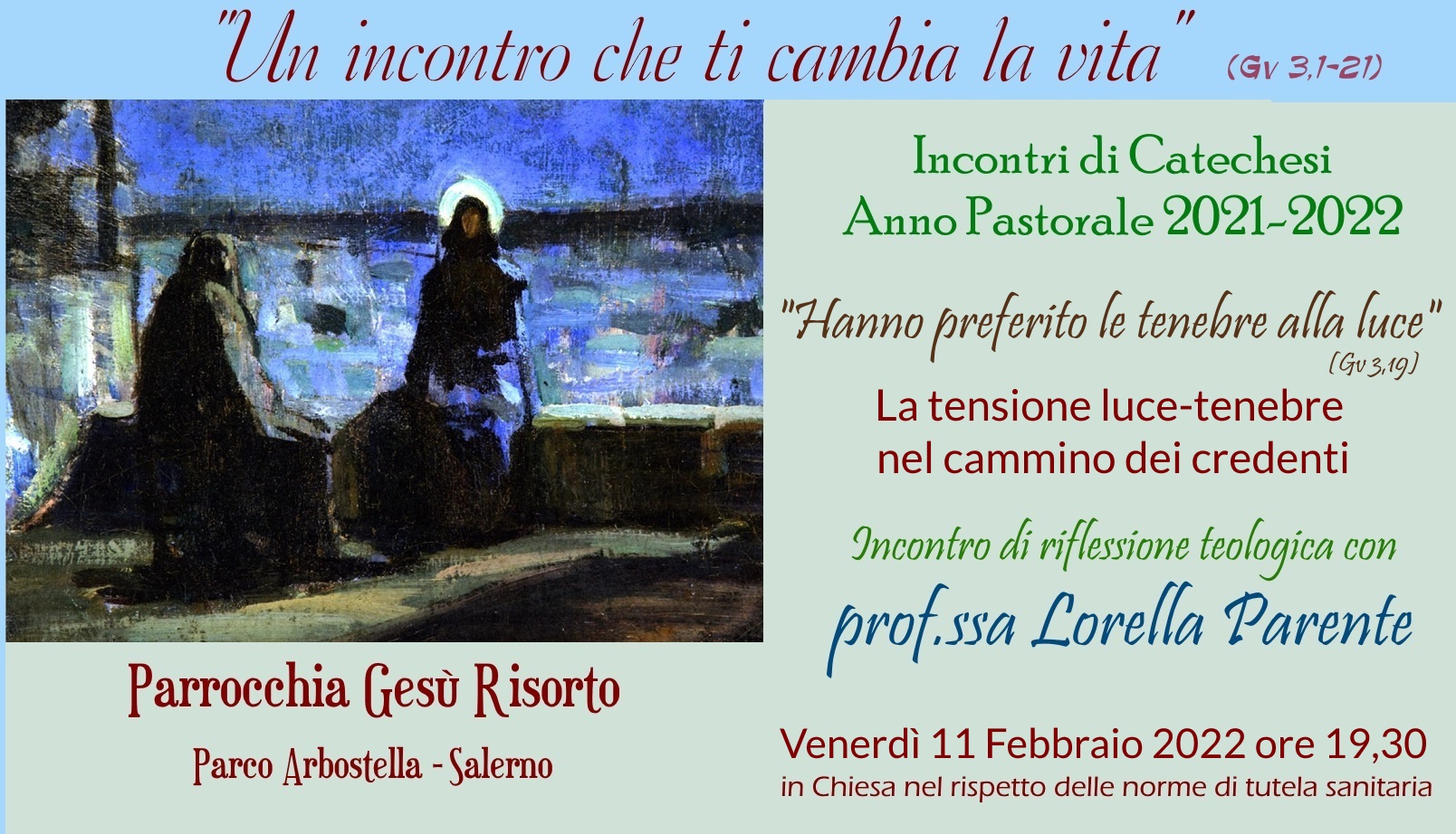 “”Hanno preferito le tenebre alla luce” (Gv 3,19). La tensione luce – tenebre nel cammino dei credenti. – é il tema dell’incontro di riflessione teologica curata dalla teologa prof.ssa Lorella Parente, Direttore Ufficio Pastorale della Cultura e dell’Arte della Diocesi di Salerno-Campagna-Acerno.
