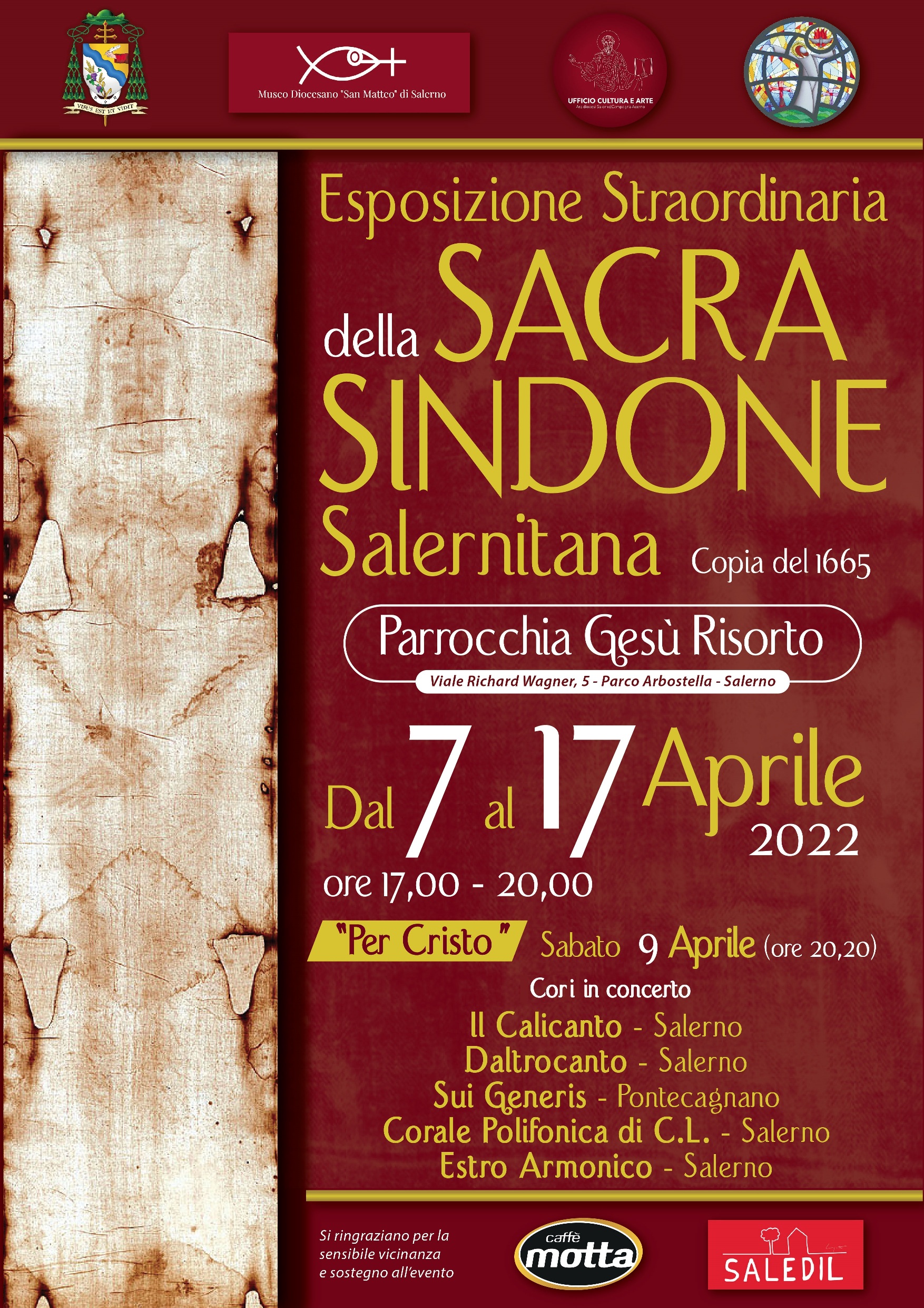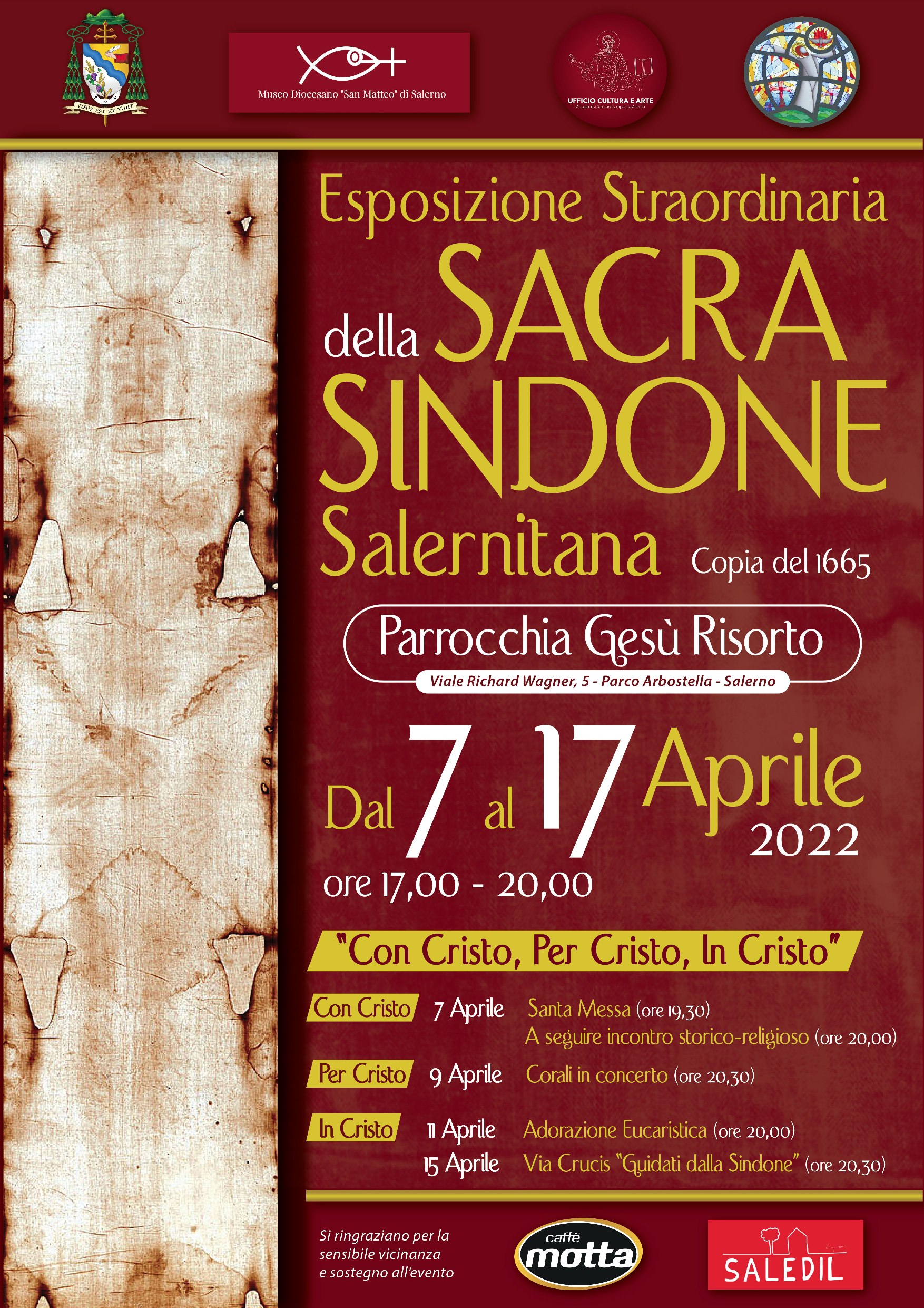 Nel primo giorno di esposizione, dopo la celebrazione della Santa Messa delle ore 19,30, interverrà per un saluto il Vescovo Monsignor Andrea Bellandi, che anticiperà l’ incontro storico-teologico-religioso “Esperienze di sofferenza vissute con fede: spunti dai Vangeli”, moderato dall’Arch. Aniello Palumbo, con la partecipazione di Don Luigi Aversa, Direttore del Museo Diocesano “San Matteo”, di Mons. Gaetano Di Palma, che insegna Introduzione alla Sacra Scrittura ed Esegesi del Nuovo Testamento nella Sezione San Tommaso d’Aquino della Pontificia Facoltà Teologica dell’Italia Meridionale di cui è Vicepreside, e degli “Sposi in Cristo”, Mimmo e Tommasina Cosimato, che racconteranno la propria esperienza di fede. Il moderatore sarà l’Arch. Aniello Palumbo