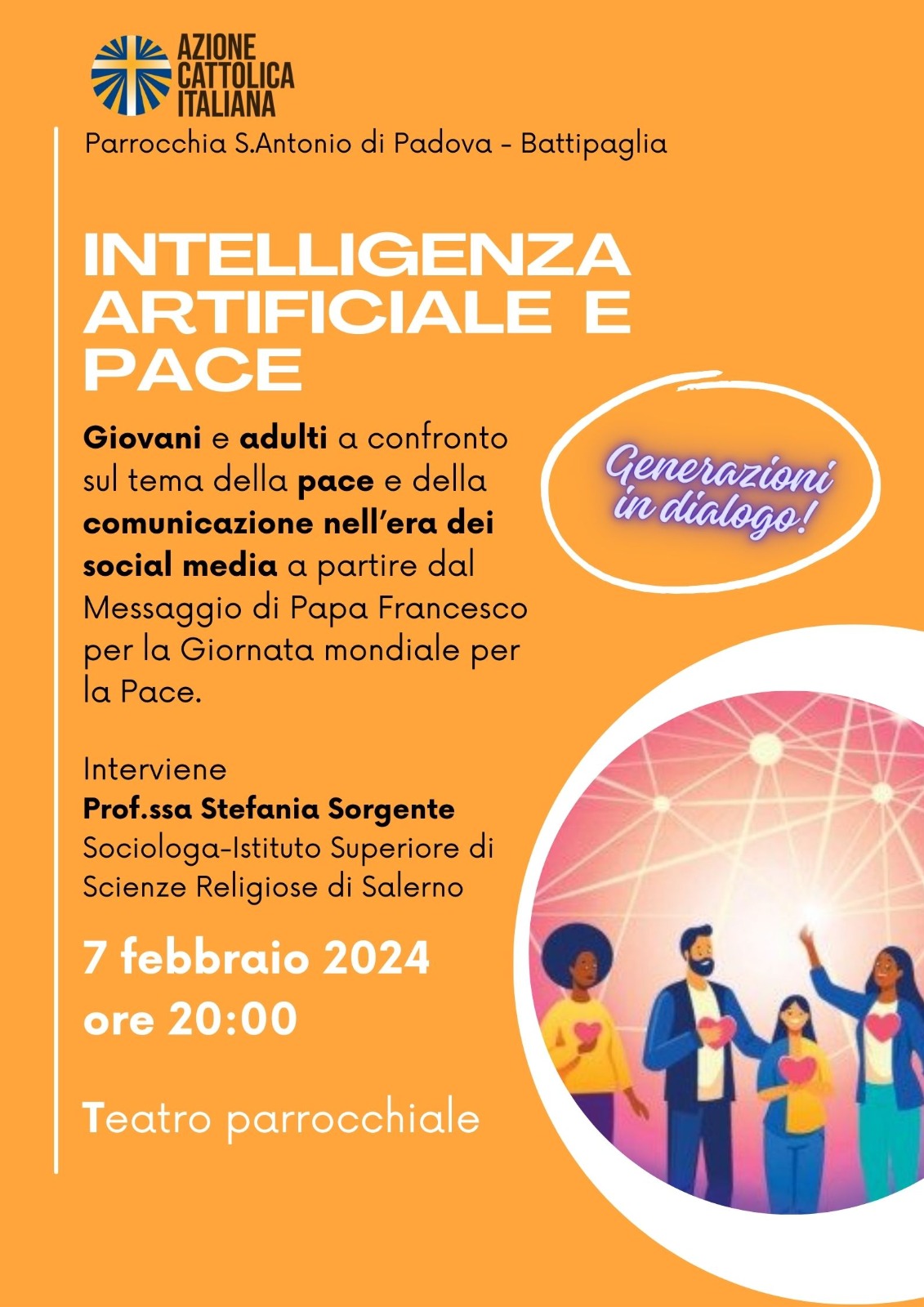 Si terrà mercoledì 7 febbraio 2024 alle ore 20.00 presso il Teatro della parrocchia “S. Antonio di Padova” a Battipaglia l’incontro pubblico sul tema “Intelligenza artificiale e pace”.
