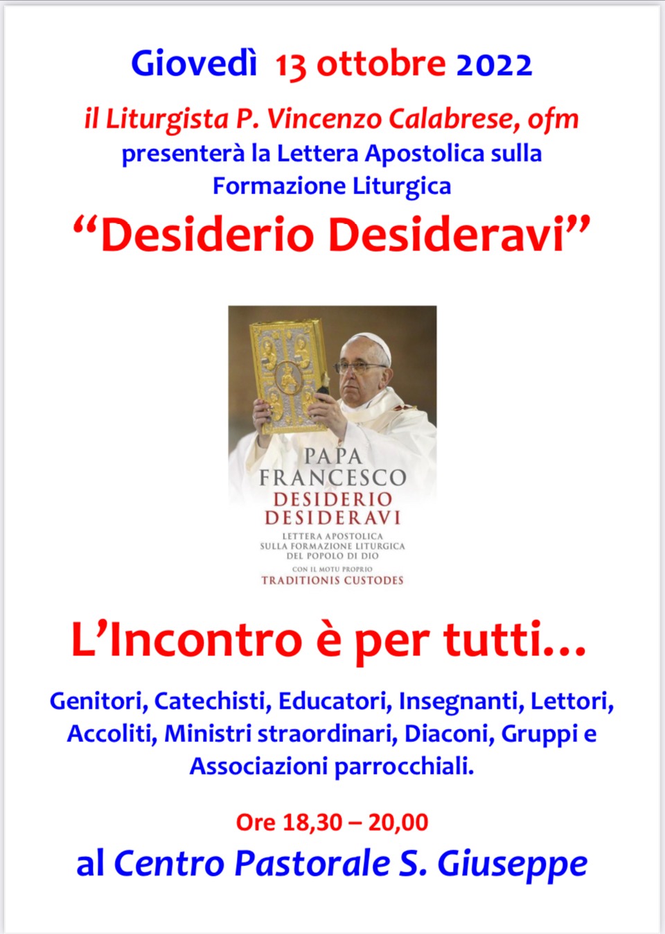 Incontro formativo aperto a tutti al centro pastorale San Giuseppe in cui Padre Vincenzo Calabrese, liturgista, presenterà la lettera Apostolica “Desiderio Desideravi” sulla formazione liturgica.