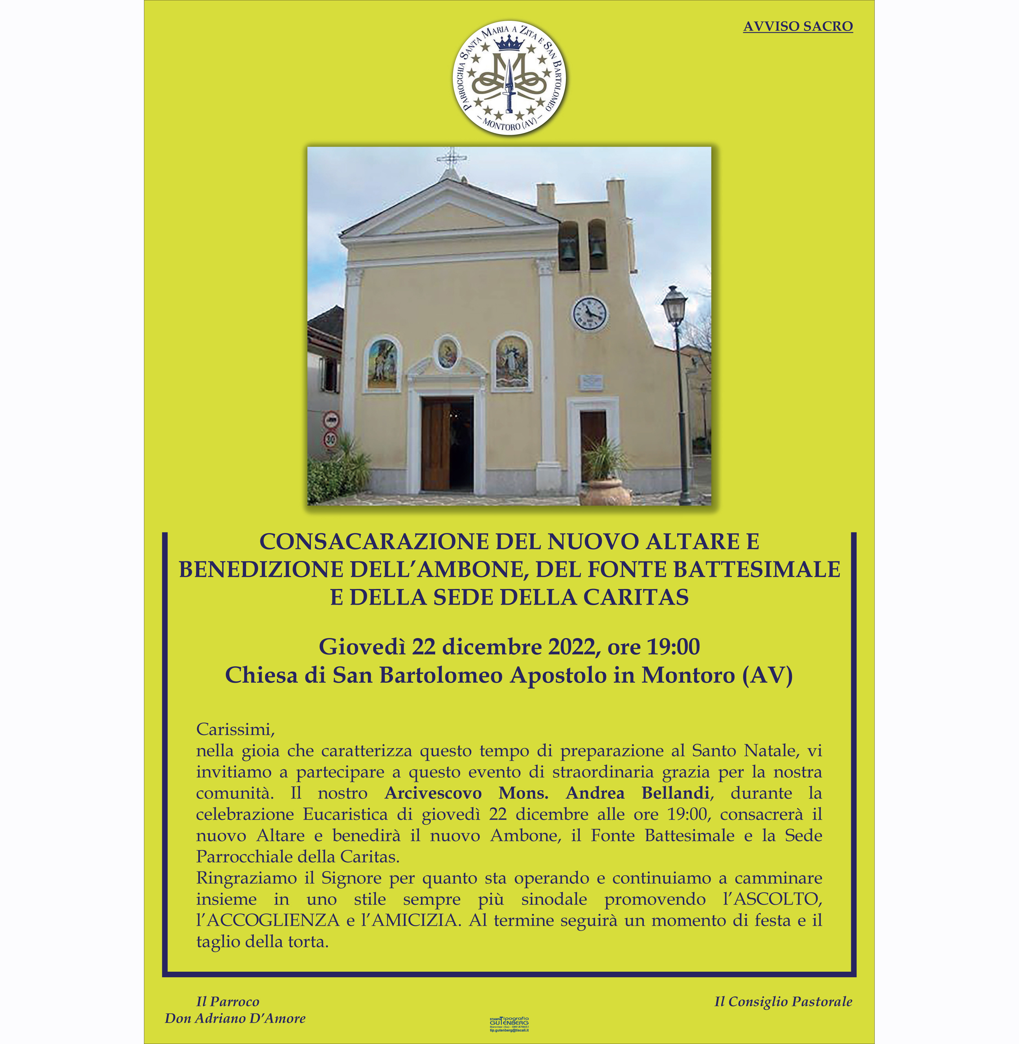 Giovedì 22 dicembre alle ore 19.00 presso la chiesa di San Bartolomeo Apostolo in Montoro, S.E. Mons. Andrea Bellandi Vescovo presiede la consacrazione del nuovo altare e la benedizione dell’ambone, del fonte battesimale e della sede della Caritas parrocchiale.
