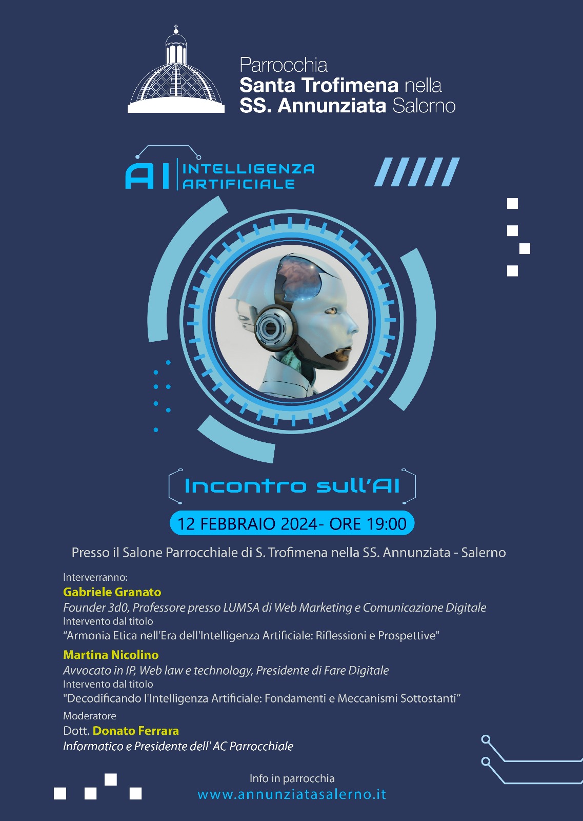 Lunedì 12 febbraio presso il Salone parrocchiale di S. Trofimena si terrà un incontro di formazione sull’Intelligenza Artificiale.