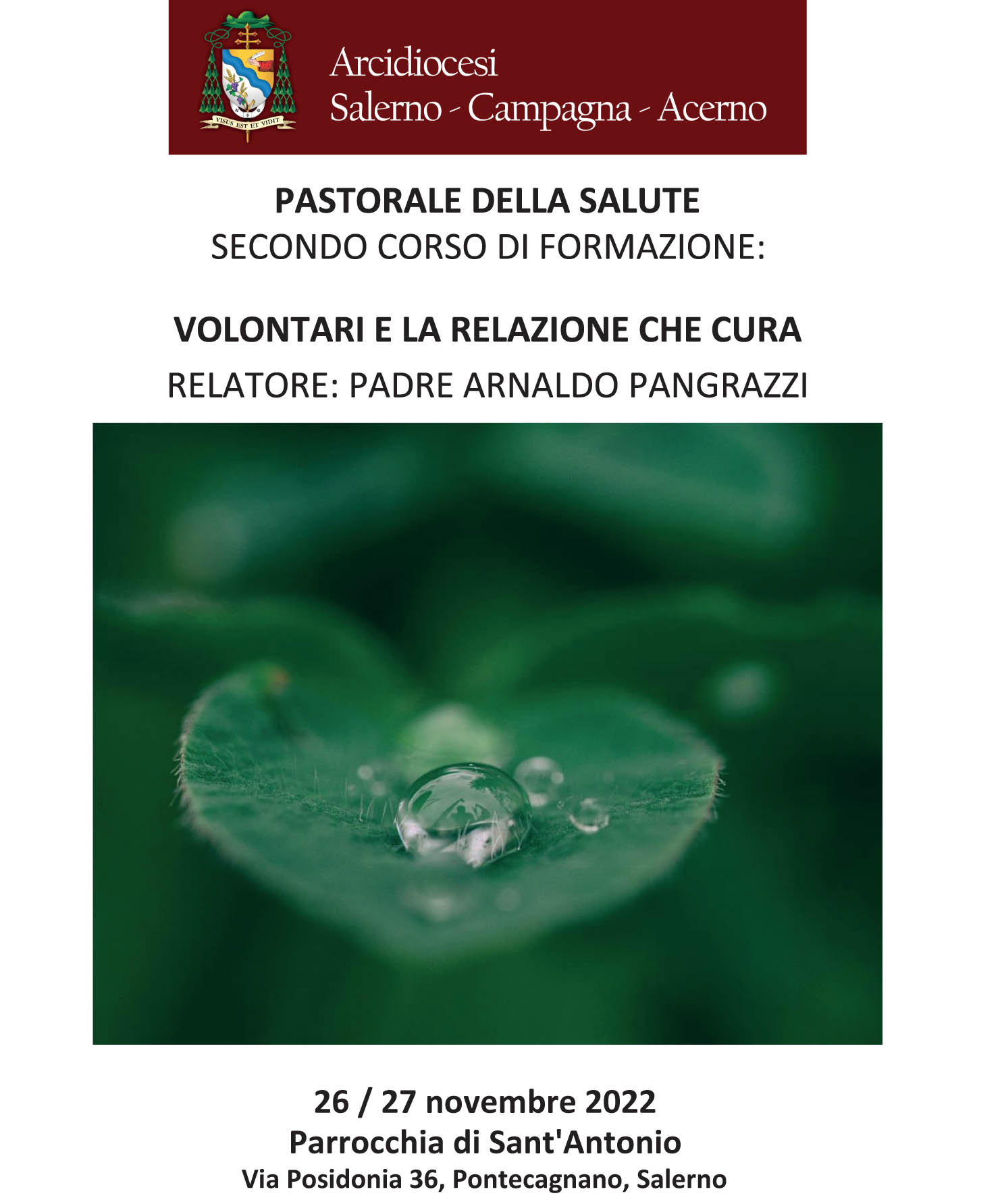 La Pastorale della Sanità propone un corso di formazione dal titolo “Volontari e la relazione che cura” che si terrà il 26 e il 27 novembre presso la parrocchia Sant’Antonio di Pontecagnano.