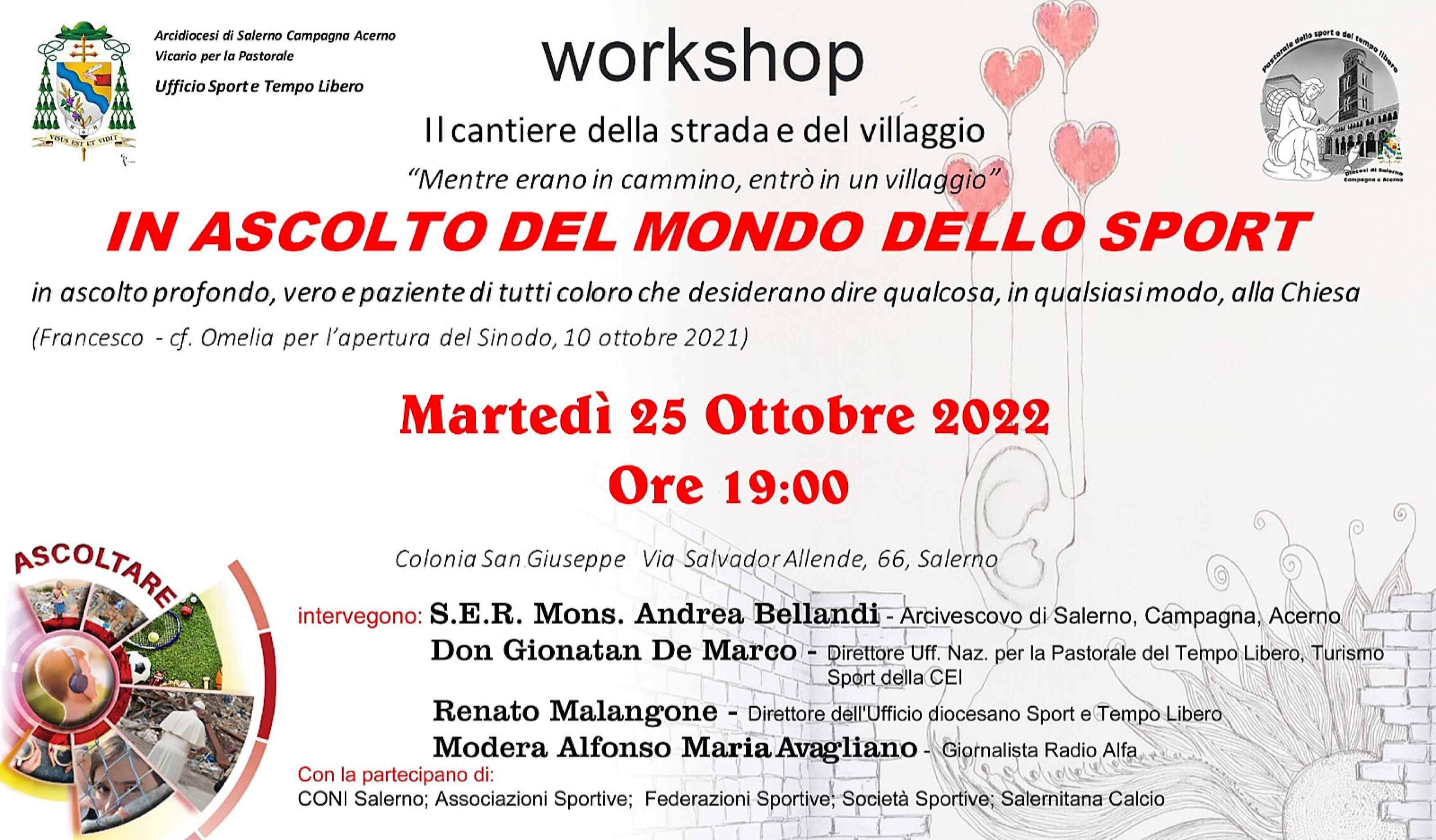 Martedì 25 ottobre alle ore 18.30 presso la Colonia San Giuseppe, Salerno, si tiene un workshop dal titolo: Il cantiere della strada e del villaggio “Mentre erano in cammino, entrò in un villaggio” organizzato dall’Ufficio per la Pastorale dello Sport e del Tempo libero diretto da Renato Malangone.