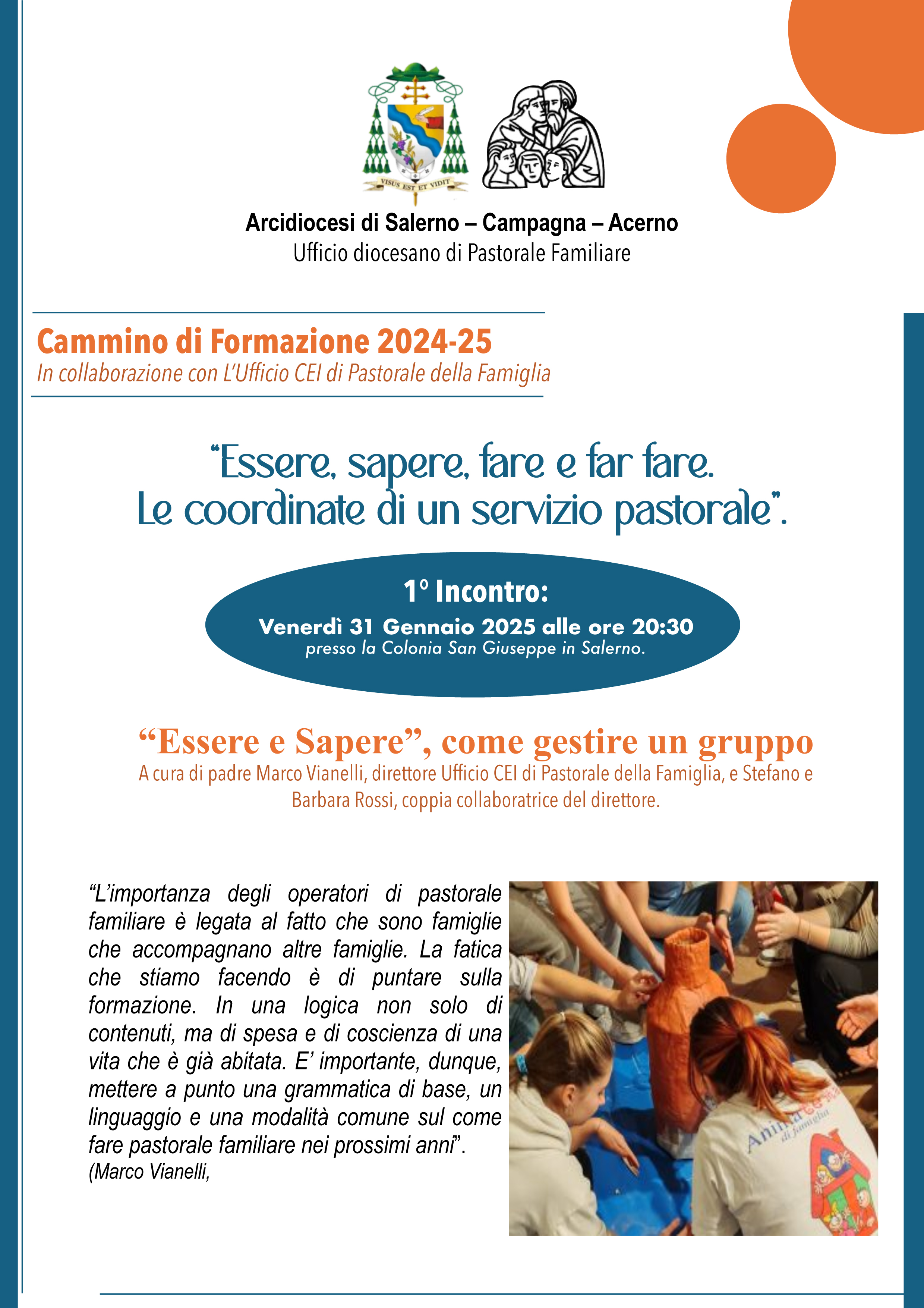 L’Ufficio Diocesano di Pastorale della Famiglia per l’anno Pastorale 2024-25 propone un percorso di formazione, affidata a padre Marco Vianelli, attuale Direttore dell’Ufficio Nazionale CEI per la Pastorale della Famiglia, che avrà come tema: “Essere, sapere, fare e far fare. Le coordinate di un servizio pastorale”.