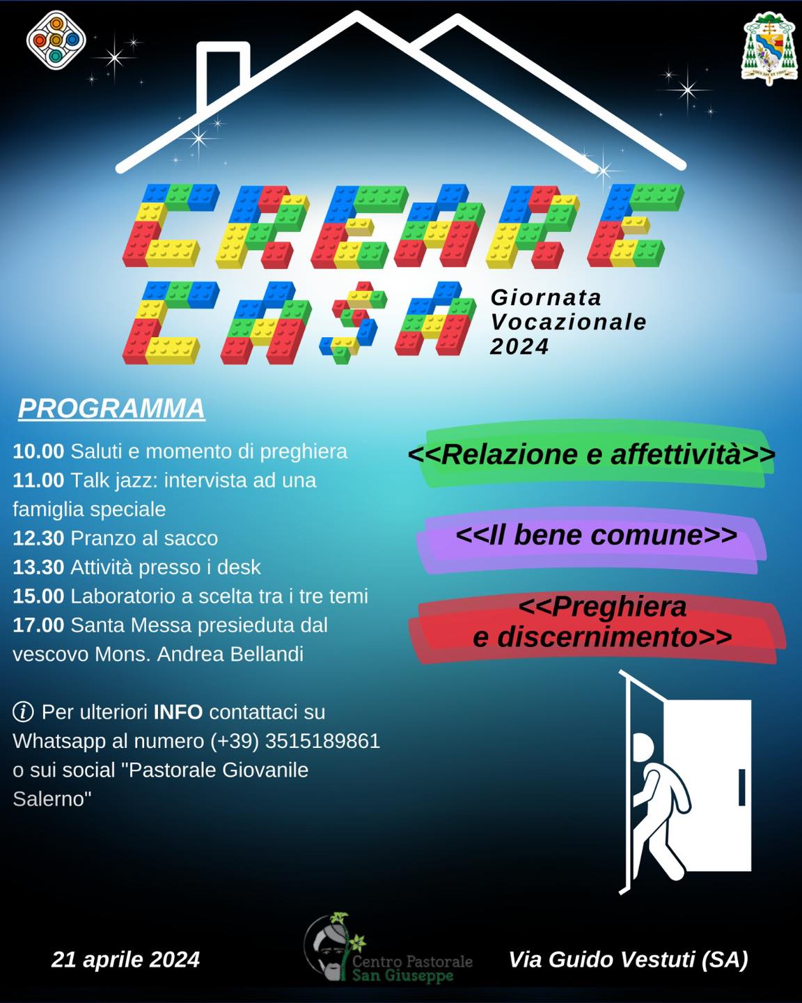 Domenica 21 aprile dalle ore 10.00, presso il Centro Pastorale S. Giuseppe in via Guido Vestuti di Salerno, in occasione della 61° Giornata per le Vocazioni, la Pastorale Giovanile e la Pastorale Vocazionale invitano a partecipare all’ultimo incontro di Creare Casa. Una giornata animata da un percorso dinamico, da laboratori attivi e, infine, dalla Santa Messa alle ore 17.00 presieduta dal nostro Arcivescovo.