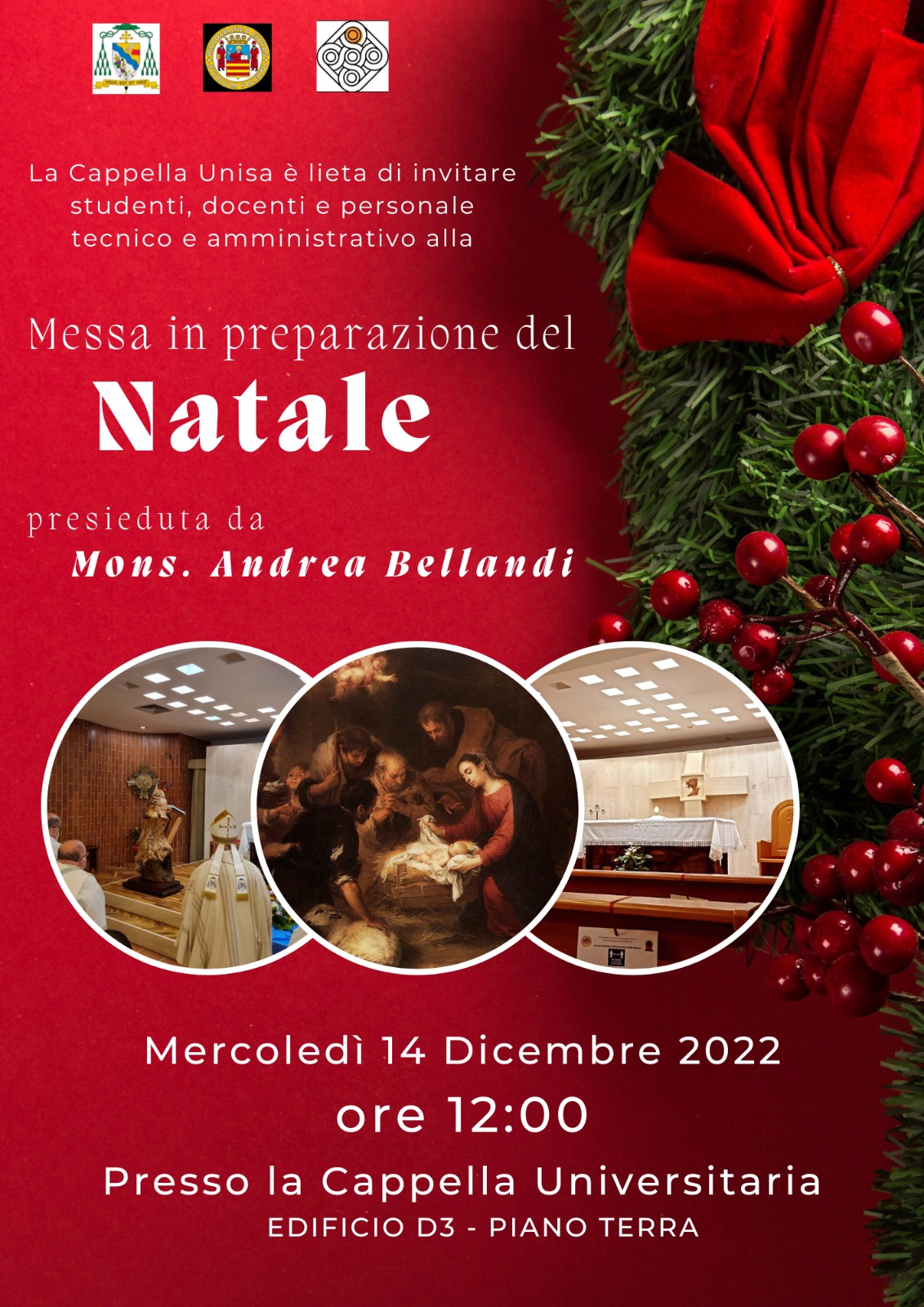 Mercoledì 14 dicembre, alle ore 12.00, come da tradizione la Pastorale Universitaria organizza la Celebrazione Eucaristica in occasione del Natale presso la Cappella UniSa presieduta dal nostro Arcivescovo, S.E. Mons. Andrea Bellandi.