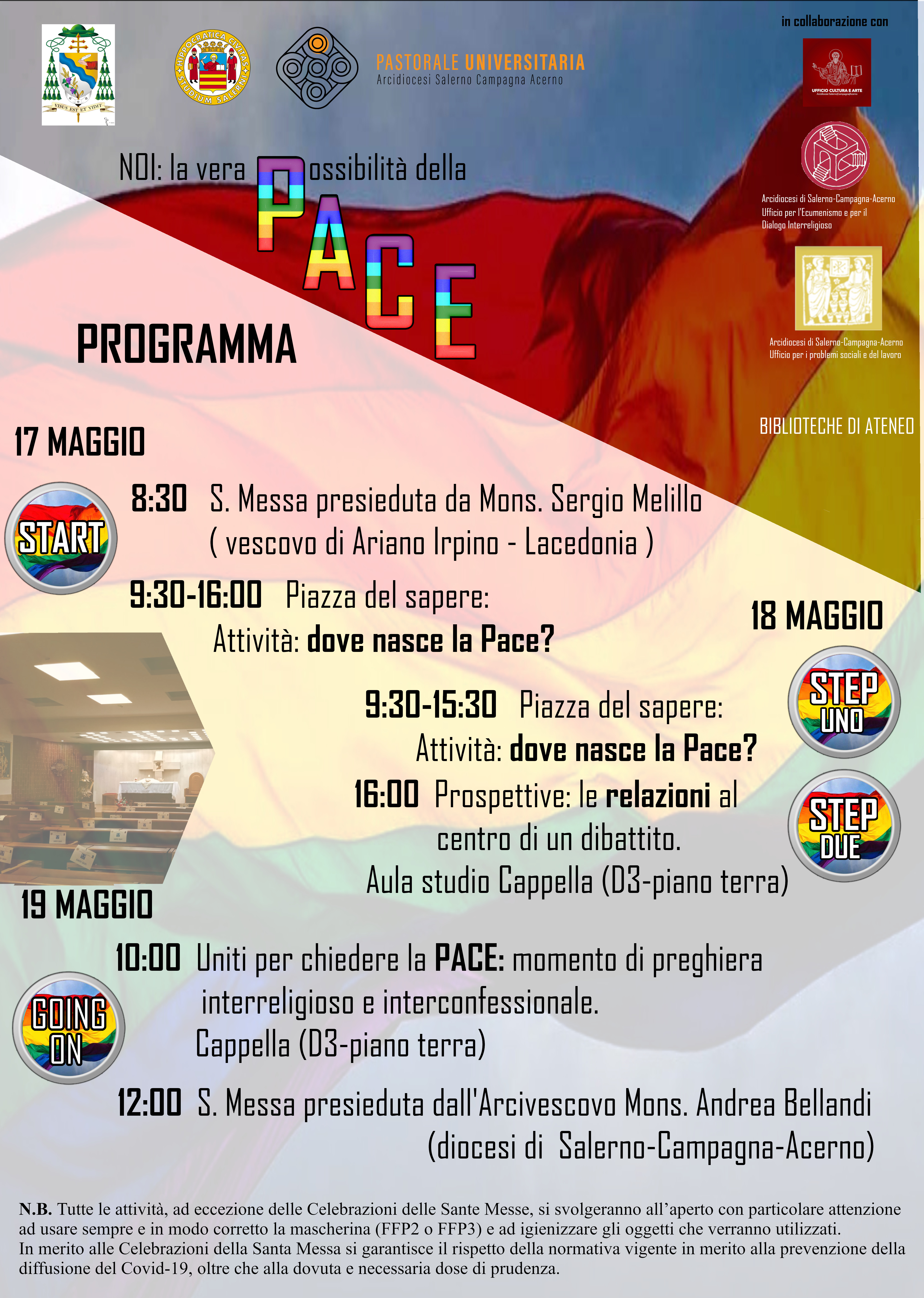 La tre giorni inizierà martedì 17 maggio alle ore 8.30 con la celebrazione della Santa Messa in Cappella Unisa presieduta da S.E. Mons. Sergio Melillo, Vescovo di Ariano Irpino – Lacedonia; dalle 9.30 alle 16.00 verranno allestiti degli stand in piazza del Sapere nei quali si potranno vivere delle dinamiche sul tema della pace.Mercoledì 18 maggio, oltre all’allestimento degli stand dalle 9.30 alle 16.00, verrà vissuto un momento di incontro e dibattito in Aula studio della Cappella Unisa (edificio D3 – piano terra) alle ore 16.00.Giovedì alle ore 10.00 presso la Cappella UniSa si terrà un momento di preghiera interreligioso e interconfessionale in collaborazione con l’ufficio diocesano per la Cultura e l’Arte, con l’Ufficio diocesano per i Problemi Sociali e del Lavoro, con l’Ufficio Diocesano per il Dialogo Ecumenico ed Interreligioso, sarà un’occasione per unire persone di differenti fedi e non credenti per chiedere uniti il dono della Pace.Alle ore 12.00 presso la Cappella Universitaria UniSa, S.E. Mons. Andrea Bellandi, celebrerà la Santa Messa a conclusione della tre giorni di animazione UniSa.