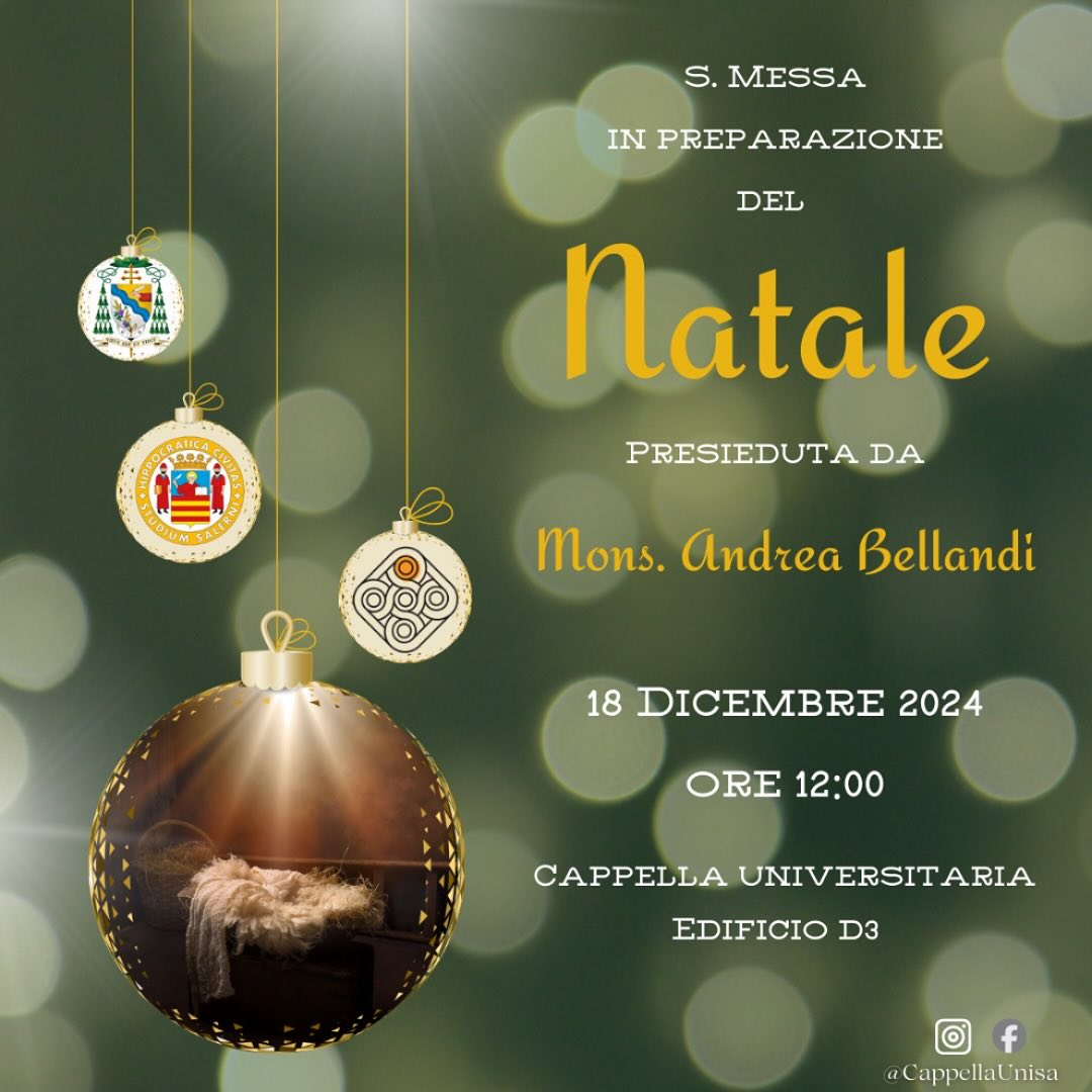 Mercoledì 18 dicembre alle ore 12.00 presso la cappella universitaria dell’Unisa S.E. Mons. Andrea Bellandi presiede la Celebrazione Eucaristica in preparazione al Natale.
