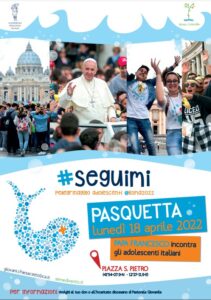 Il servizio di Pastorale degli Oratori, in comunione con l’Ufficio diocesano di Pastorale Giovanile, ha avviato la raccolta delle adesioni al Pellegrinaggio di lunedì 18 aprile, degli adolescenti italiani a Roma, per incontrare Papa Francesco. L’incontro avrà il suo momento clou nel dialogo tra gli adolescenti e il Santo Padre, seguito da una Veglia di preghiera con l’ascolto e la meditazione del capitolo 21 del Vangelo di Giovanni.