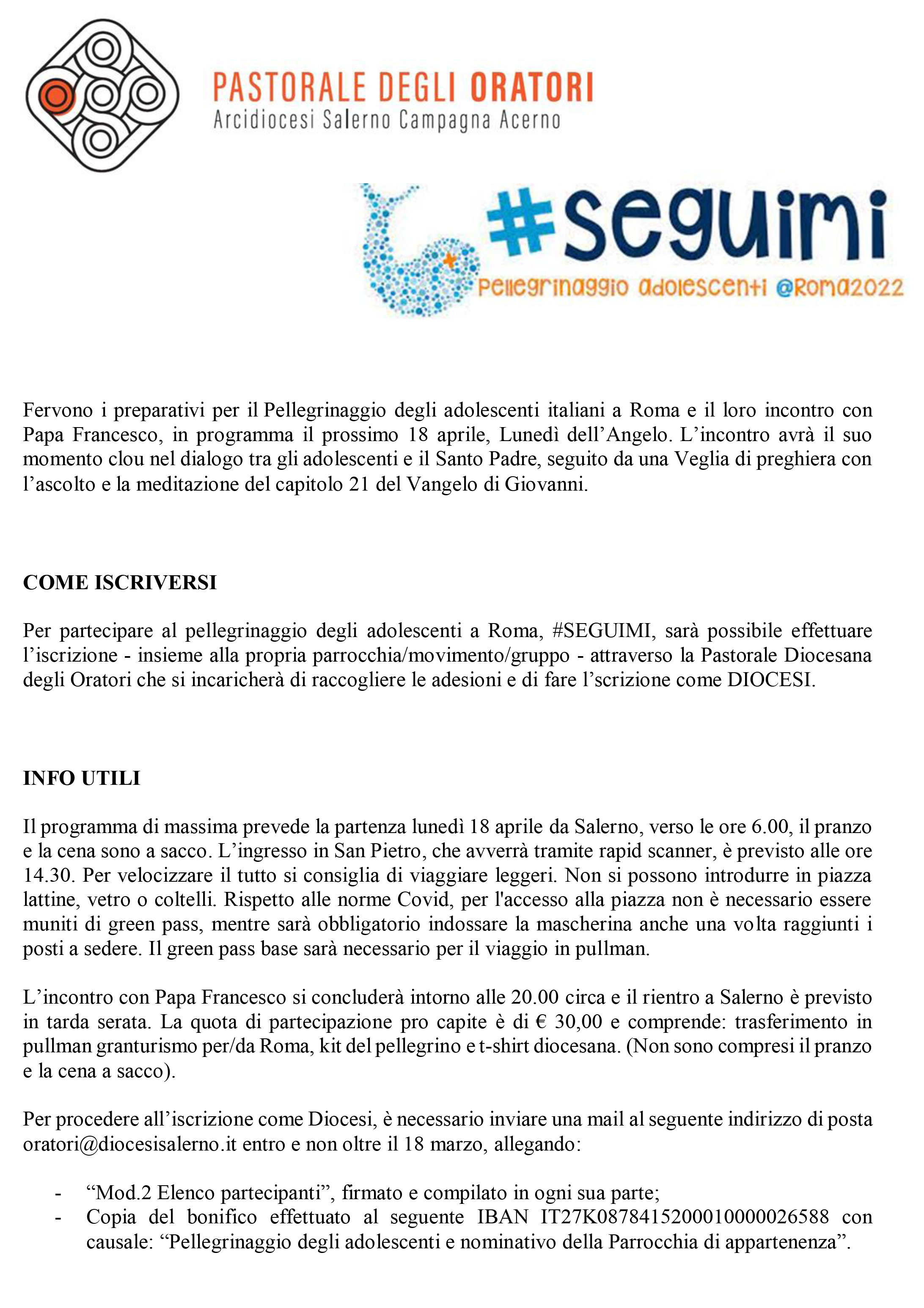 Per procedere all’iscrizione come Diocesi, è necessario inviare una mail al seguente indirizzo di posta oratori@diocesisalerno.it entro e non oltre il 18 marzo, allegando: