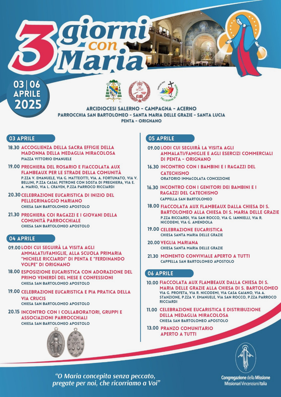 Dal 3 al 6 aprile 2025 l’Arcidiocesi di Salerno-Campagna-Acerno ospiterà una significativa tappa del pellegrinaggio nazionale della Sacra Effigie della Madonna della Medaglia Miracolosa, organizzato dai Missionari Vincenziani d’Italia nella Parrocchia San Bartolomeo – Santa Maria delle Grazie – Santa Lucia di Penta, offrendo a tutti i fedeli un’occasione speciale di preghiera, riflessione e devozione.