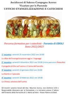 Venerdì 25 novembre alle ore19.00 si terrà il primo incontro del percorso formativo per i catechisti della Forania di Eboli. Gli incontri saranno tenuti dal diac. Maurizio Scorza, vice direttore UCD e Responsabile diocesano per la formazione, e si terranno presso il Salone dell’Oratorio della Parrocchia di S. Maria ad Intra – Rione Paterno di Eboli.