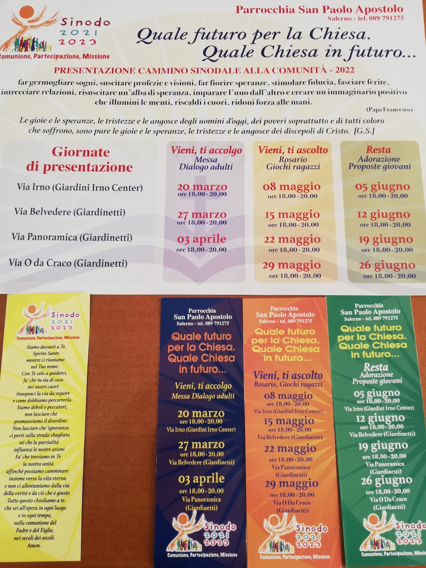 La parrocchia di San Paolo Apostolo di Salerno ha organizzato un percorso sul Cammino Sinodale dal titolo “Quale futuro per la Chiesa. Quale Chiesa in futuro”. Messe itineranti, Rosario itinerante, Adorazione itinerante con incontro delle famiglie e confronto sul cammino sinodale “Comunione,Partecipazione e Missione”.
