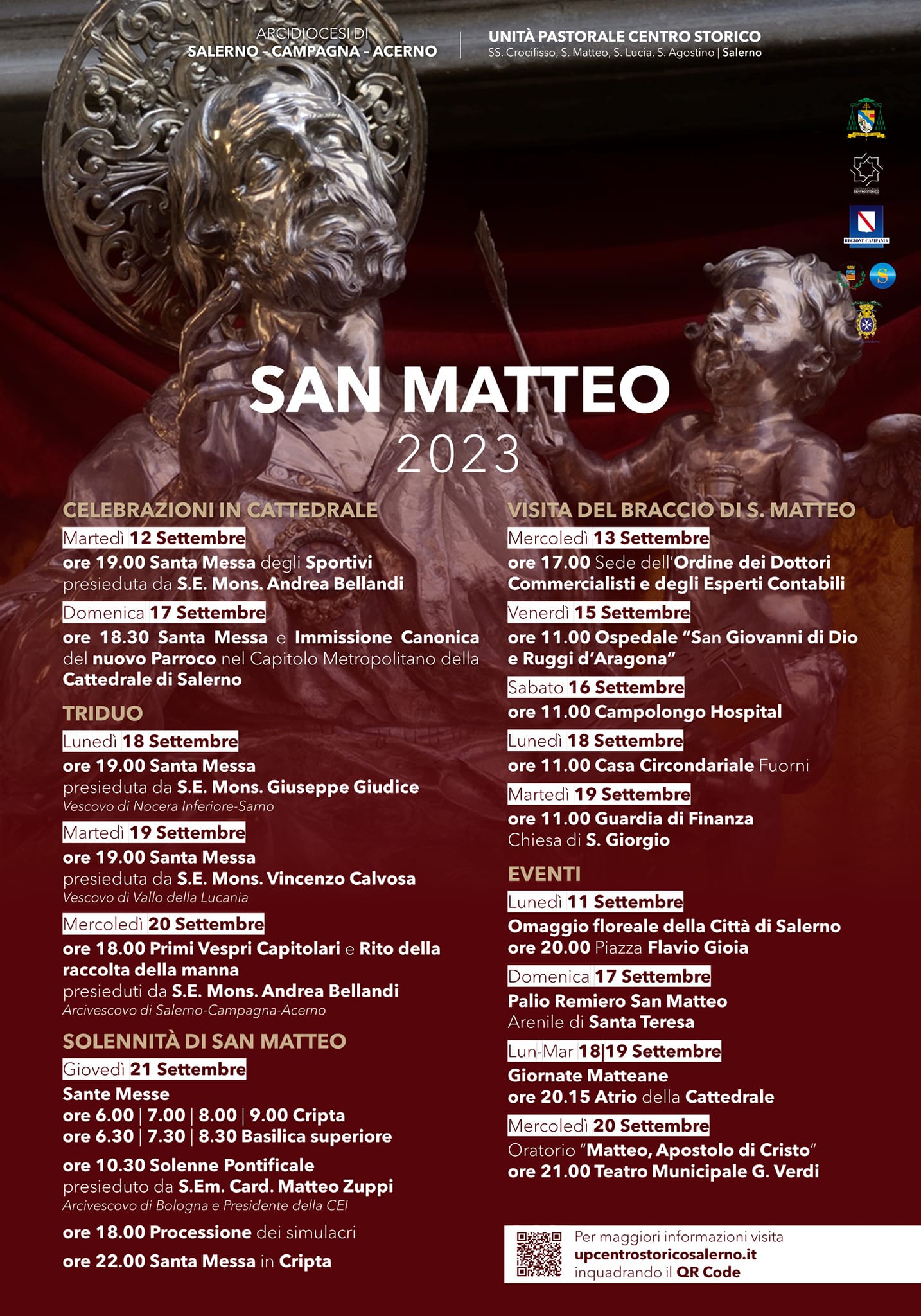 L’intera Comunità Diocesana e la Città di Salerno, dunque, si preparano ad onorare San Matteo. Di seguito, il programma dei Solenni Festeggiamenti del Santo Patrono di Salerno. Tra le novità di quest’anno, il ripristino del Triduo Solenne e della tradizionale raccolta della Manna (liquido conservato sotto l’altare dedicato al Santo nella Cripta della Cattedrale di Salerno, anticamente raccolto il 6 maggio – giorno della traslazione delle Reliquie di San Matteo – e il 21 settembre- giorno dedicato a San Matteo Apostolo).