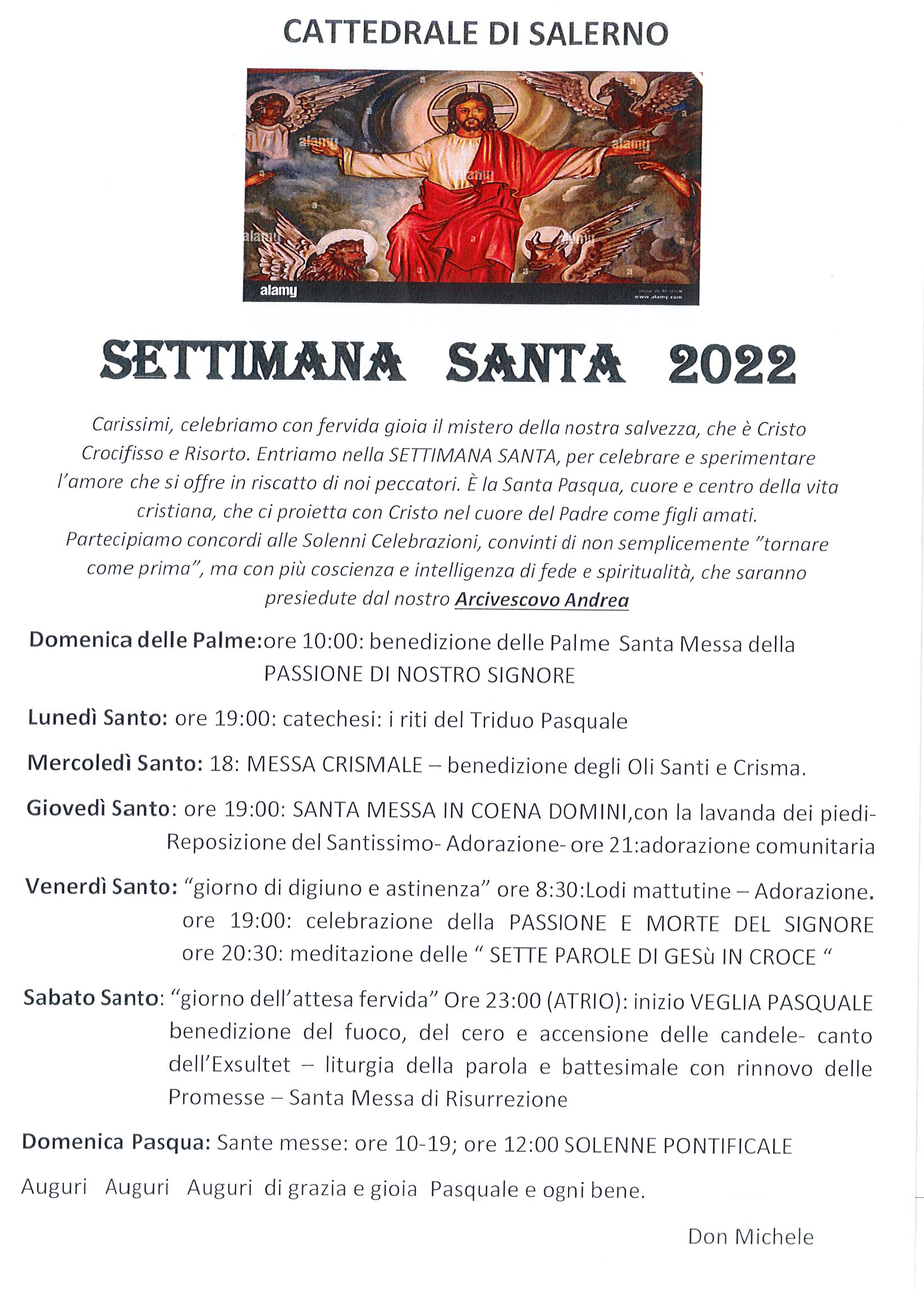 - Giovedì Santo alle ore 10.00 S. E. Mons. Bellandi presiede la S. Messa nella Casa Circondariale di Salerno-Fuorni, che sarà animata dal Coro dei gruppi della fraternità di Comunione e Liberazione.
