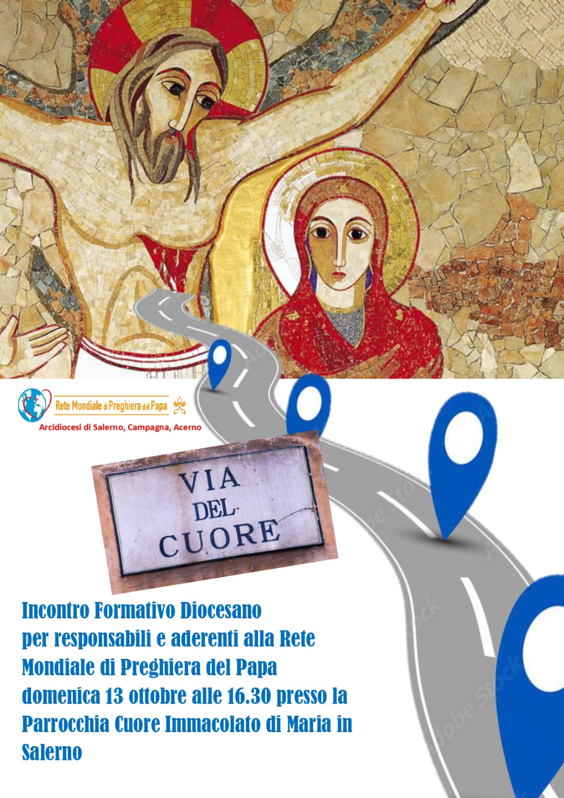 Domenica 13 ottobre, alle ore 16.30, presso la parrocchia Cuore Immacolato di Maria in Salerno, si terrà un incontro formativo diocesano, dal titolo “Via del Cuore”, che intende iniziare l’itinerario formativo per i membri della Rete Mondiale di Preghiera del Papa – Apostolato della Preghiera.