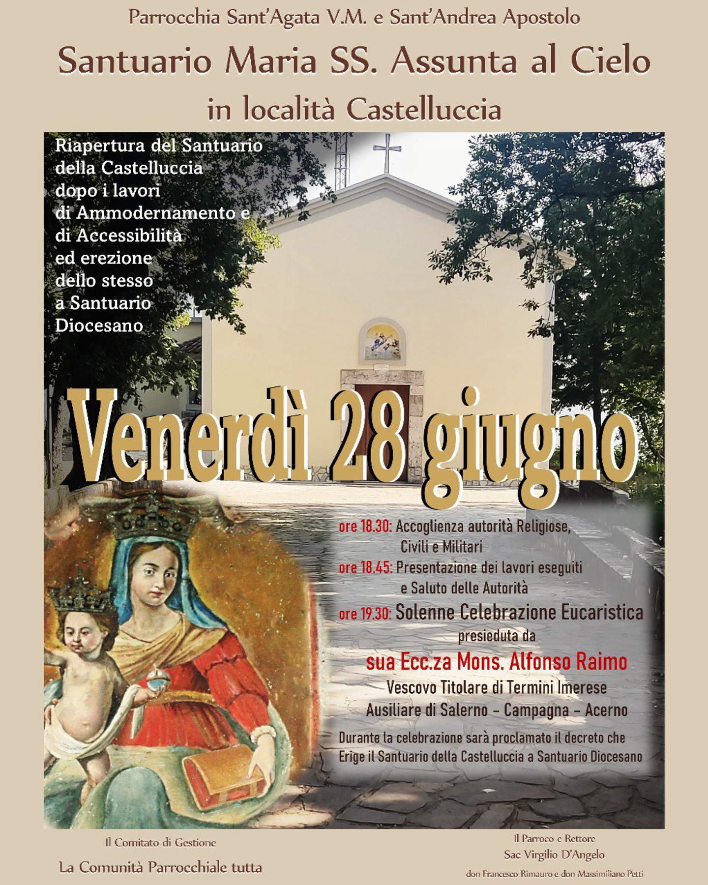 Venerdì 28 giugno alle ore 18.30, il Santuario della Castelluccia in Sant’Agata Irpina, eretto a santuario diocesano il 31 maggio 2023 da S.E. Mons. Andrea Bellandi, chiuso per lavori di riqualificazione e ammodernamento dell’accessibilità, riapre al culto con la cerimonia di inaugurazione, presieduta da S.E. Mons. Alfonso Raimo, nella quale sarà proclamato ufficialmente il decreto di erezione.