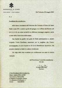Ringraziamenti pervenuti dalla Segreteria di Stato a seguito dei voti augurali espressi al Santo Padre Leone XIV in occasione della sua elezione.