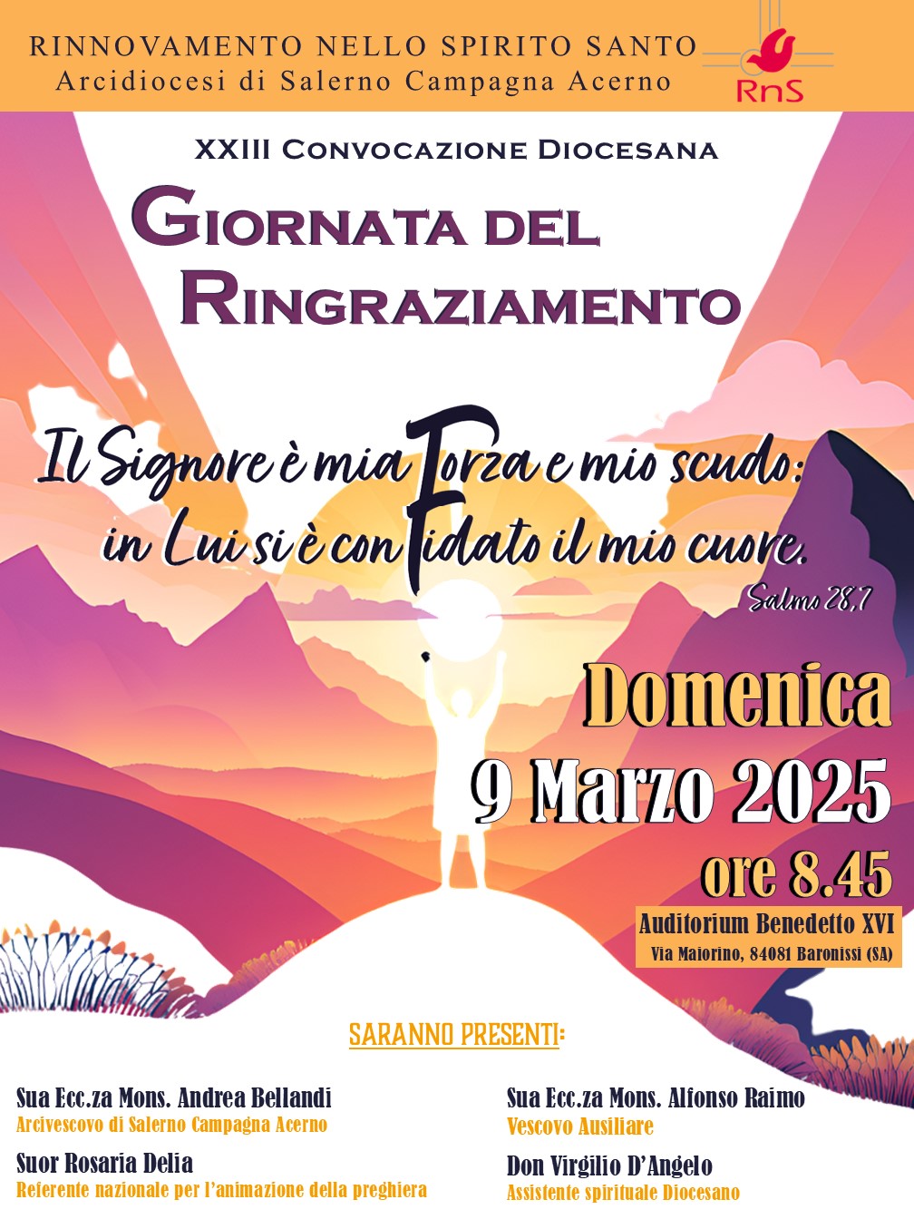 Domenica 9 marzo a partire dalle 8.30 presso l’Auditorium Benedetto XII, Baronissi si terrà il Convegno Diocesano “Festa del Ringraziamento del Rinnovamento dello Spirito” . Il tema scelto per la giornata è tratto dal Salmo 28,7: “Il Signore è mia forza e mio scudo: in Lui si è confidato il mio cuore”.