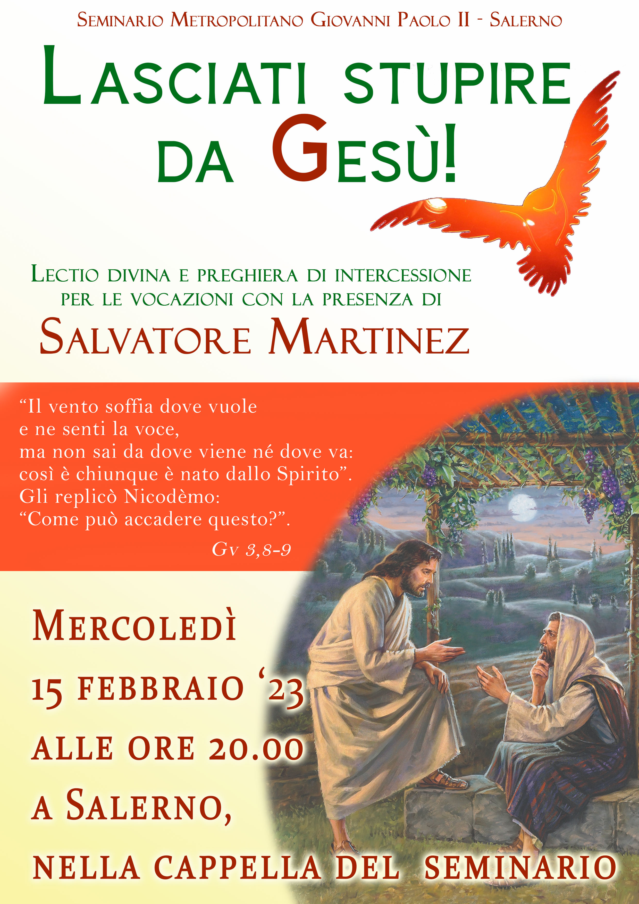 Mercoledì 15 febbraio alle ore 20.00, presso la cappella del Seminario Metropolitano “Giovanni Paolo II” di Pontecagnano Faiano si terrà un incontro dal titolo “Lasciati stupire da Gesù” organizzato dal Rinnovamento nello Spirito. Salvatore Martinez, Presidente Nazionale del RnS guiderà la Lectio divina e la preghiera di intercessione per le vocazioni.
