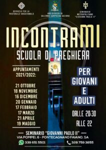 Giovedì 20 gennaio alle ore 21.00 si tiene il quarto appuntamento della Scuola di Preghiera organizzato dal Servizio per la Pastorale Vocazionale in collaborazione con il Seminario rivolto a giovani e adulti. A causa della situazione epidemiologica l’incontro si terrà online sulla piattaforma Ciscowebex, sarà possibile partecipare cliccando su questo link.