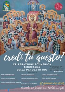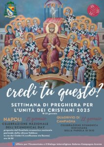 L’Ufficio diocesano per l’ecumenismo e il dialogo interreligioso invita, dunque, a partecipare a due appuntamenti importanti: martedì 21 gennaio a Napoli per l’Ecumenical Day, celebrazione nazionale che vedrà tutti i rappresentanti delle Chiese cristiane in Italia confluire nella Cattedrale di Napoli, e mercoledì 22 gennaio alle ore 19.00, presso la parrocchia di san Giuseppe e san Michele arcangelo al Quadrivio di Campagna. La partecipazione di S.E. Mons. Andrea Bellandi insieme ai rappresentanti delle diverse comunità cristiane del territorio è segno di speranza per i cristiani, che si riconoscono figli di “Dio, Padre onnipotente, Creatore del cielo e della terra” e compagni di quel “solo Signore, Gesù Cristo, Unigenito Figlio di Dio”.